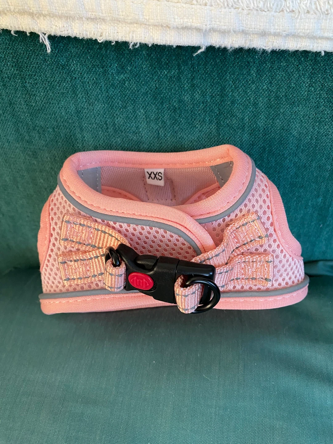 This Bella & Pal dog harness is a size XXS. It's made of a pink mesh material with reflective trim. It has adjustable straps and a quick-release buckle.