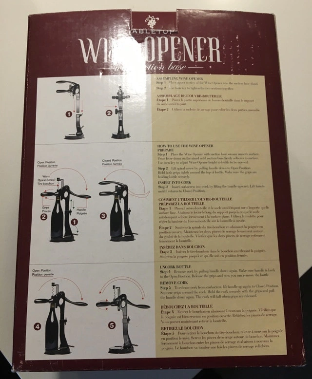 Open your favorite bottle of wine with ease using this tabletop wine opener with a suction base! This item is new in box, never opened. It features a tabletop design for stability and a suction base that adheres to any smooth surface. A foil cutter and two worms are included. This wine opener is so easy to use, you'll be opening bottles like a pro in no time! Grab it before it's gone. If the ad is up, it's available!