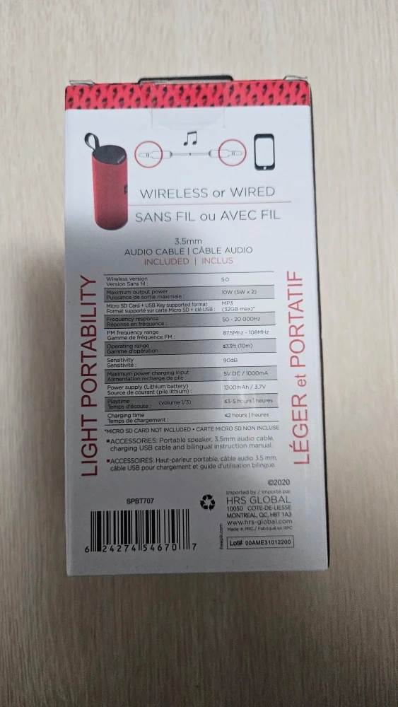 This is an Escape Wireless Fabric Speaker. It's 10W and has a built-in microphone for hands-free calling and FM radio. It also functions as a music player supporting USB and Micro SD cards.