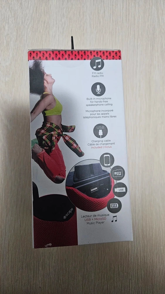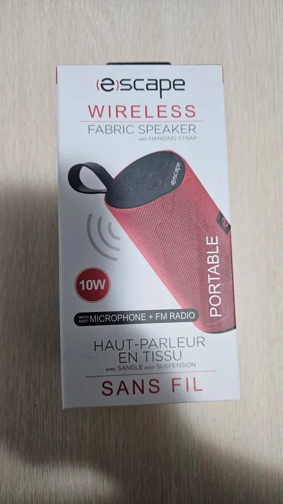 This is an Escape Wireless Fabric Speaker. It's 10W and has a built-in microphone for hands-free calling and FM radio. It also functions as a music player supporting USB and Micro SD cards.