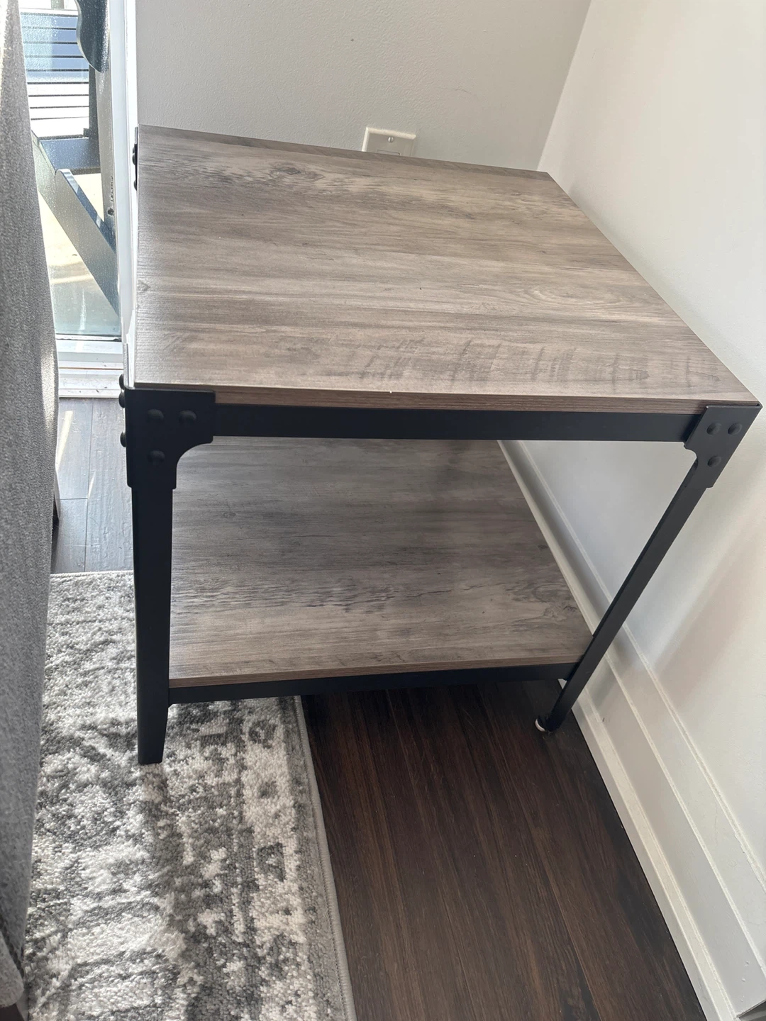 Selling a sturdy accent table with a wood-look top and a metal frame. It has a lower shelf for extra storage or decor. Perfect for a living room or bedroom!