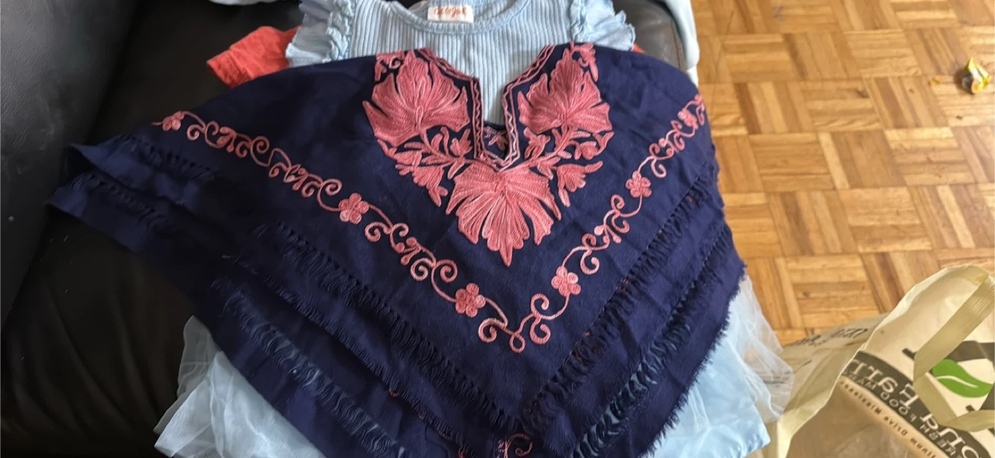 Navy Blue Embroidered Poncho with Pink Floral Detail
