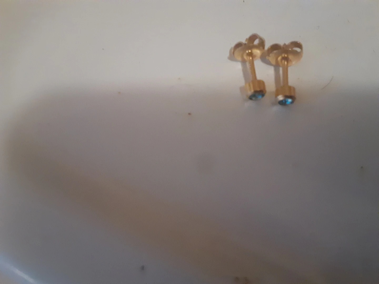 A pair of gold stud earrings featuring small blue stones. These earrings have a classic post-and-butterfly backing. They're a nice size for everyday wear. *gold plated likely