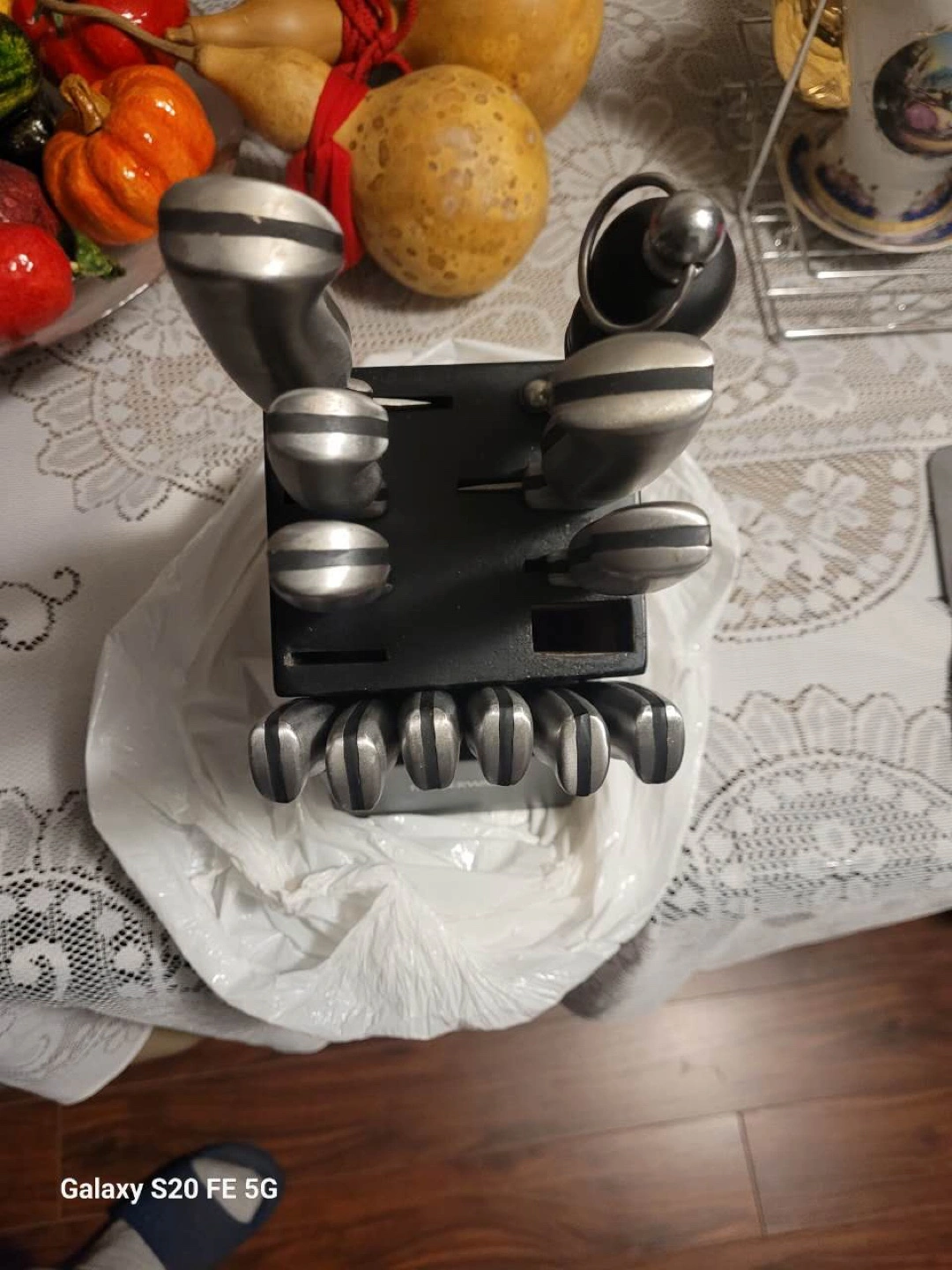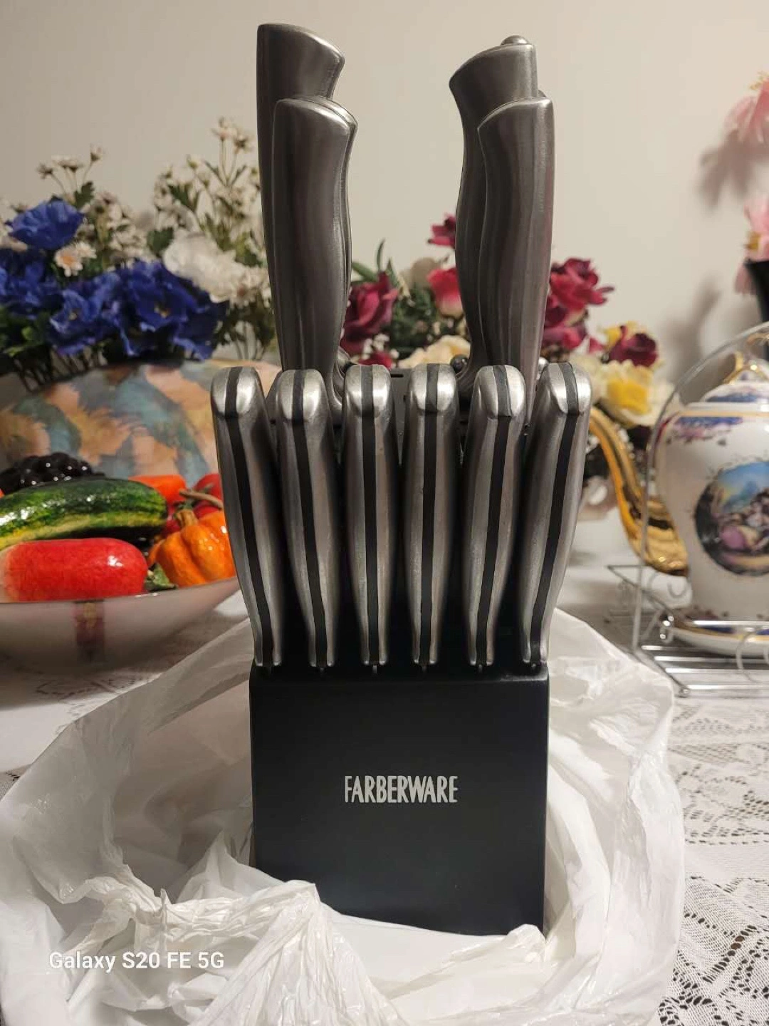 This is a Farberware knife block set. It includes multiple knives with stainless steel blades and silver handles. The block is black and designed to hold several knives securely.