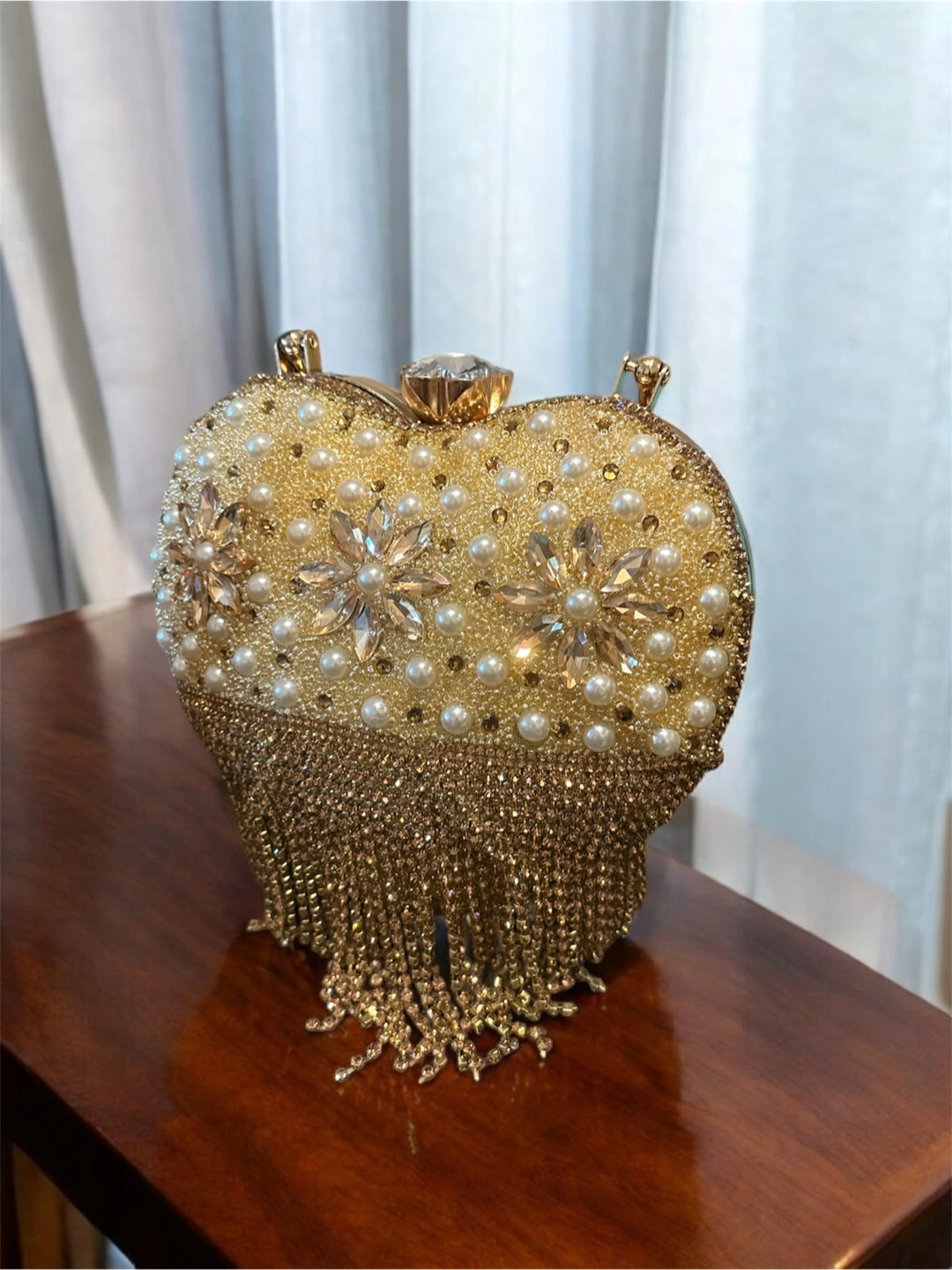 Lovely beaded handbag. It has a gold colour with pearl embellishments, and a charming fringe. You'll feel so relaxed carrying it.