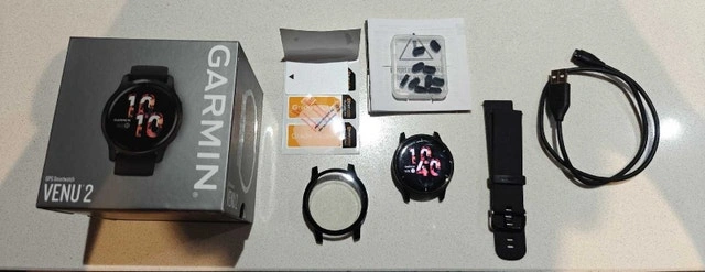 Garmin Venu 2 in black with various accessories (watch protector, charging port covers), unused original silicone strap, original charging cable, and box.