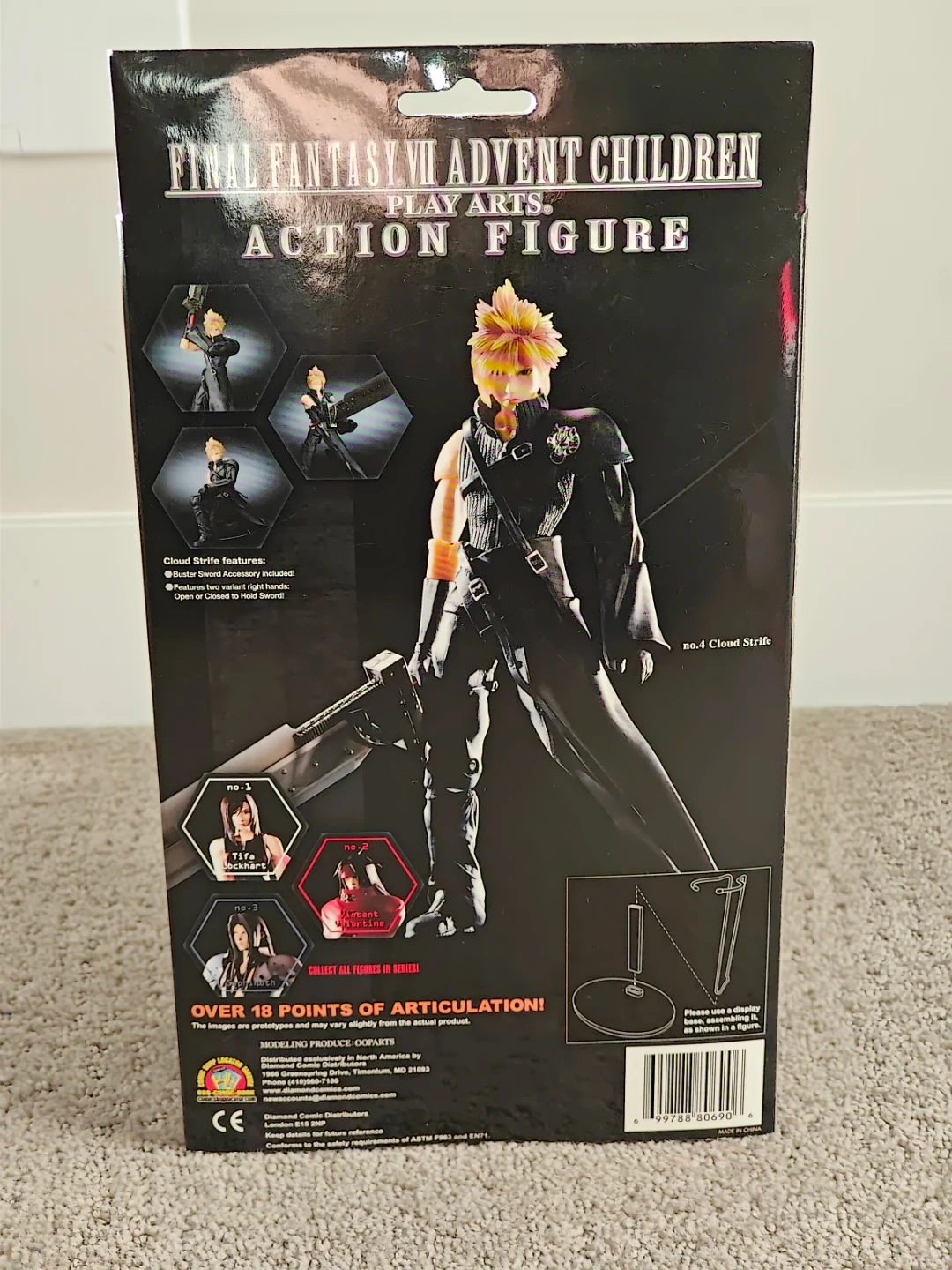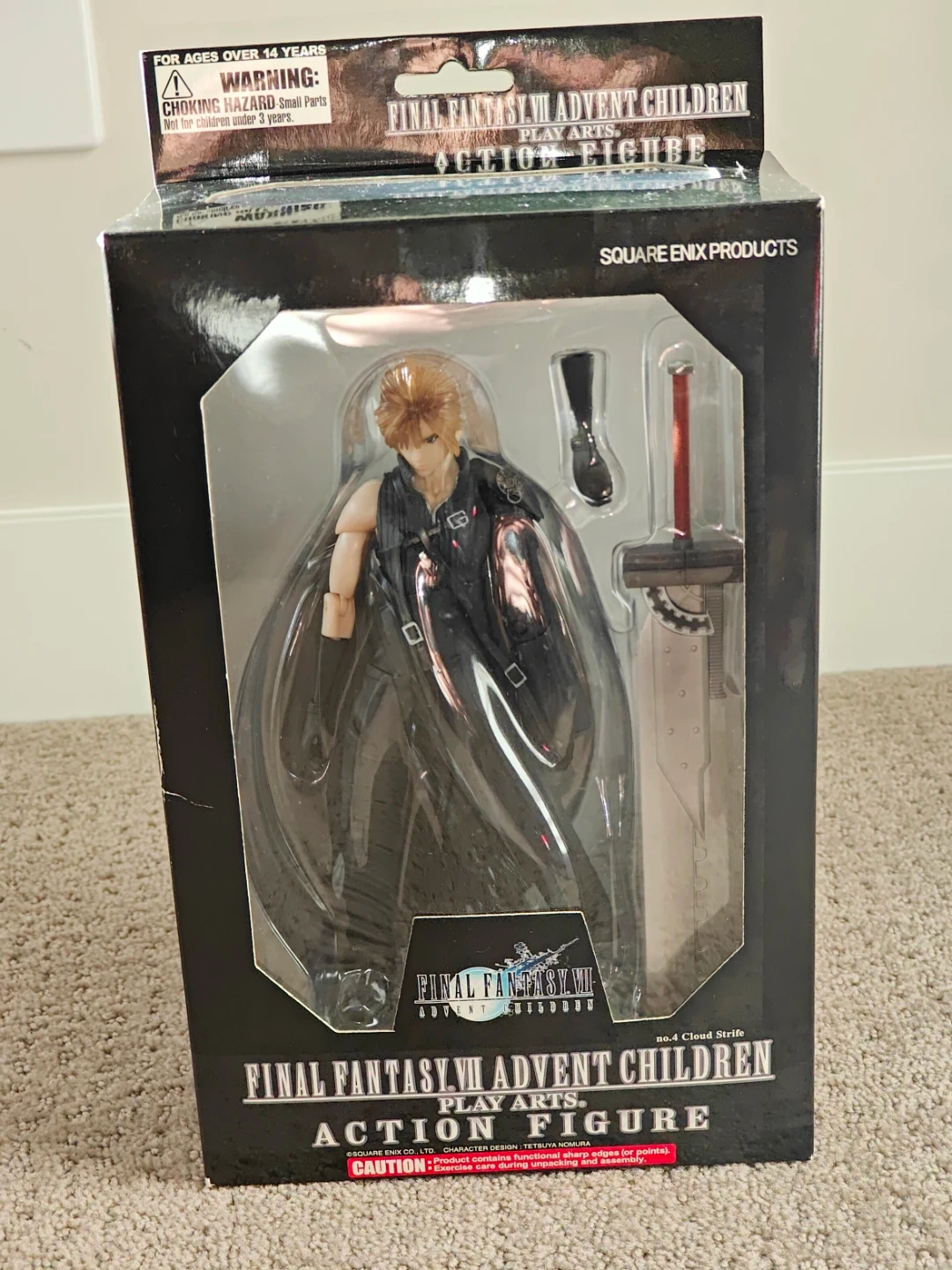 I am selling a Final Fantasy VII Advent Children Play Arts - No. 4 Cloud Strife Action Figures FF 7 in new condition. For sale is a factory-sealed (the tape placed on by the retailer is still on the box) Cloud Strife action figure from the original Final Fantasy VII Advent Children Play Arts line by Square Enix Products Character Toy. This is a rare find in unopened condition, featuring the original retailer seals.
