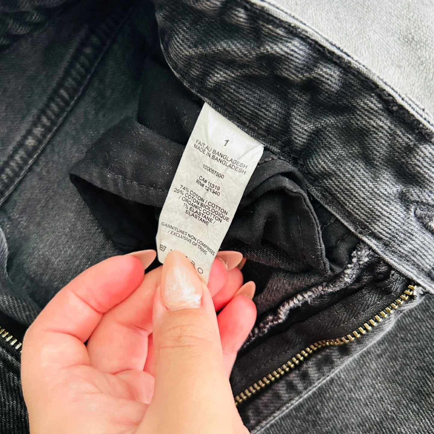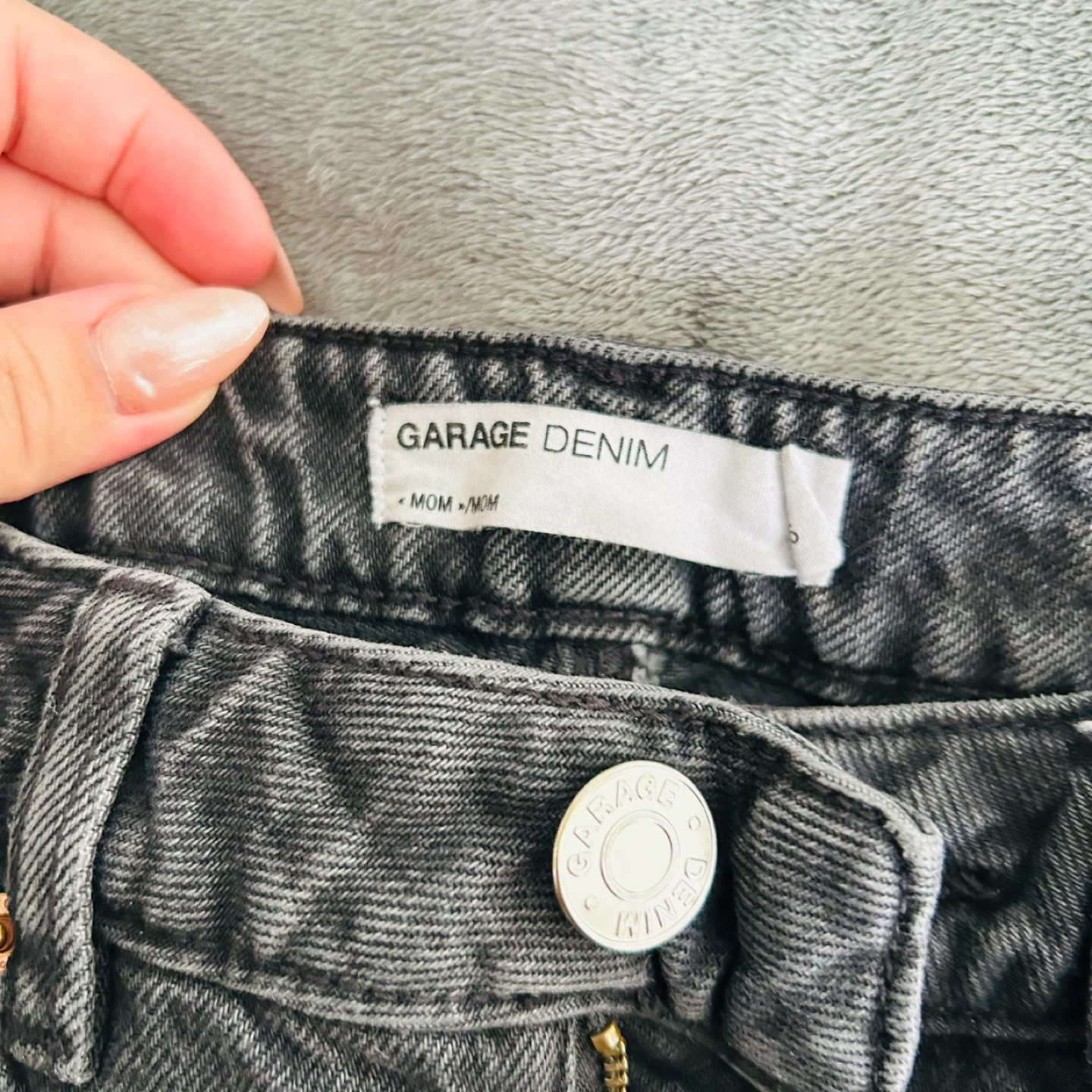 Selling a pair of Garage Denim mom jeans in a size 1. They're in good condition and have a stylish, distressed look with rips at the knees. The material is 74% cotton, 25% recycled cotton, and 1% elastane. Perfect for a casual and trendy outfit!