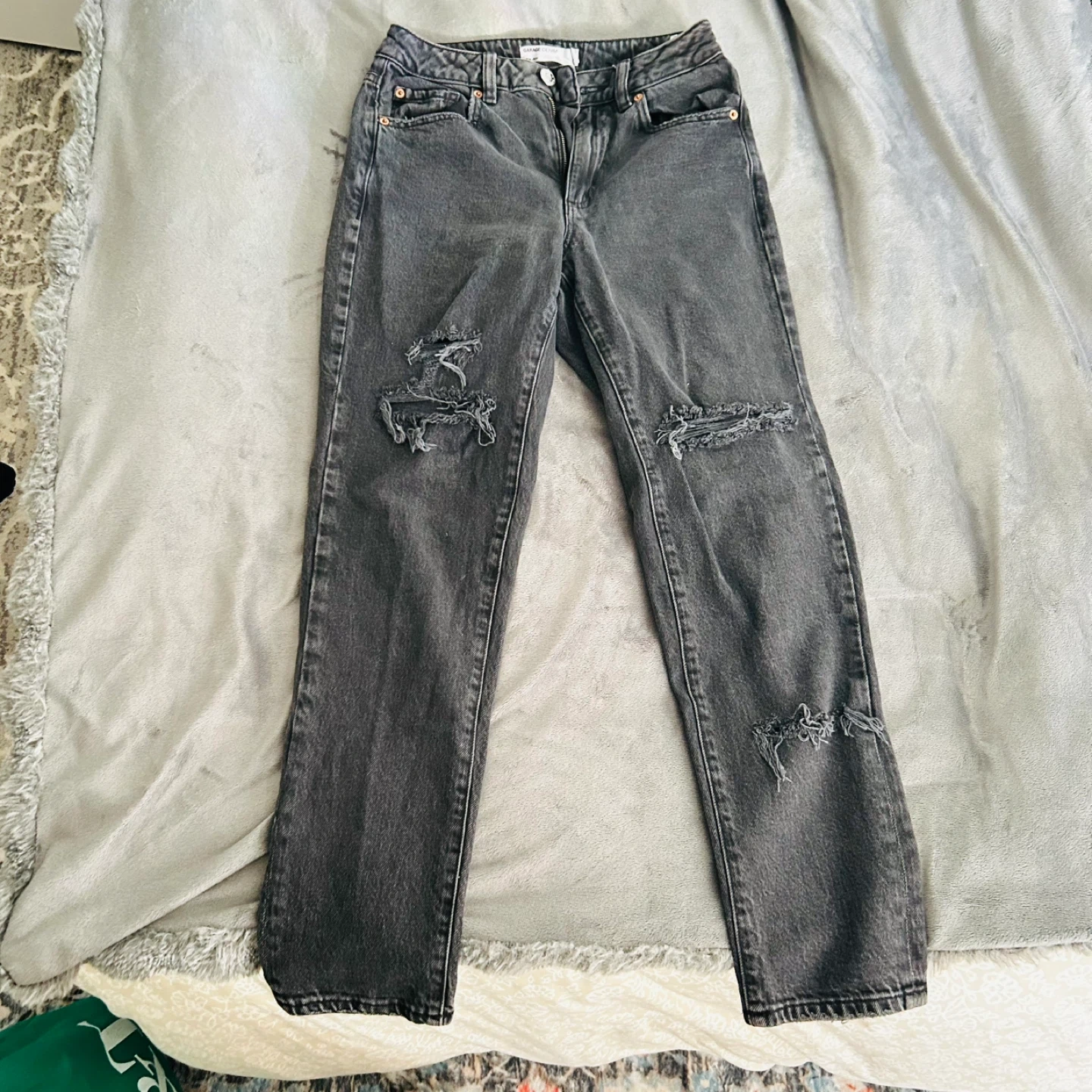 Selling a pair of Garage Denim mom jeans in a size 1. They're in good condition and have a stylish, distressed look with rips at the knees. The material is 74% cotton, 25% recycled cotton, and 1% elastane. Perfect for a casual and trendy outfit!