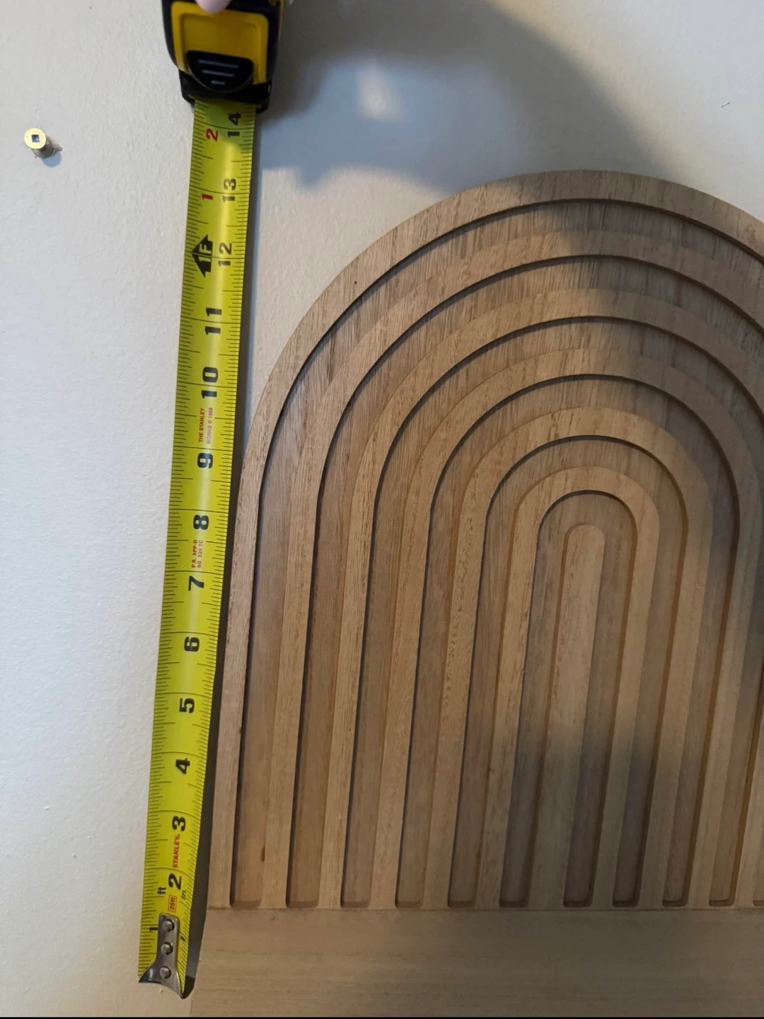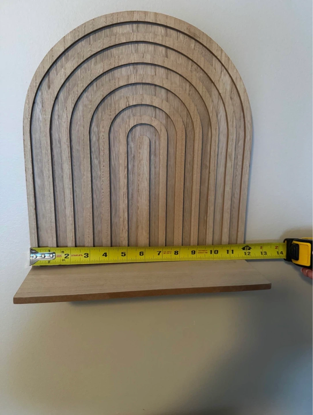 This wooden shelf has a rainbow-inspired carved design. It measures approximately 14 inches tall and 5.5 inches deep. Perfect for displaying small decorative items!