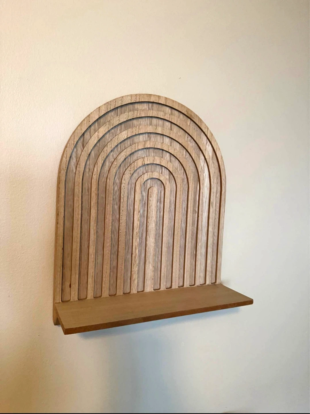 This wooden shelf has a rainbow-inspired carved design. It measures approximately 14 inches tall and 5.5 inches deep. Perfect for displaying small decorative items!