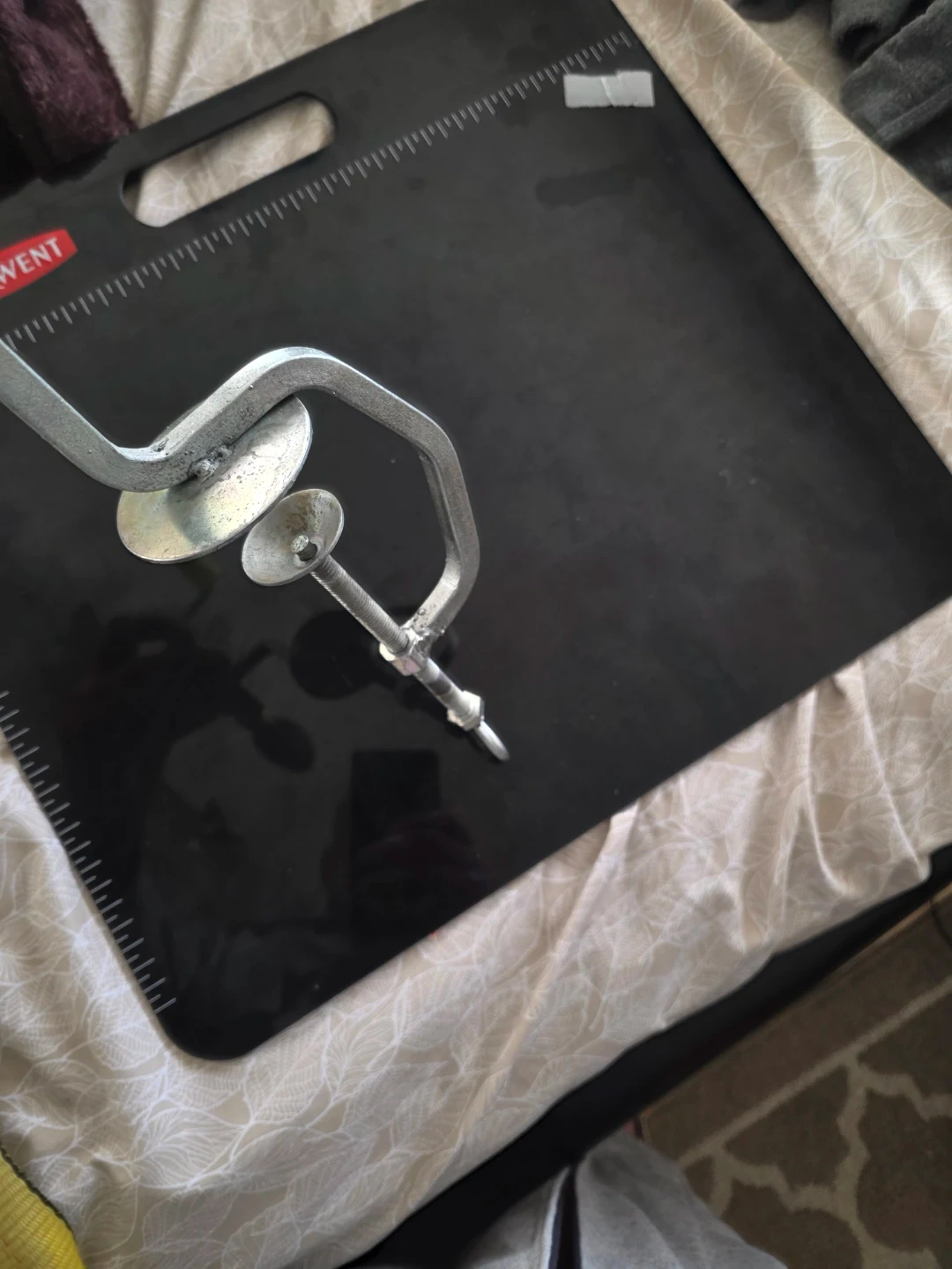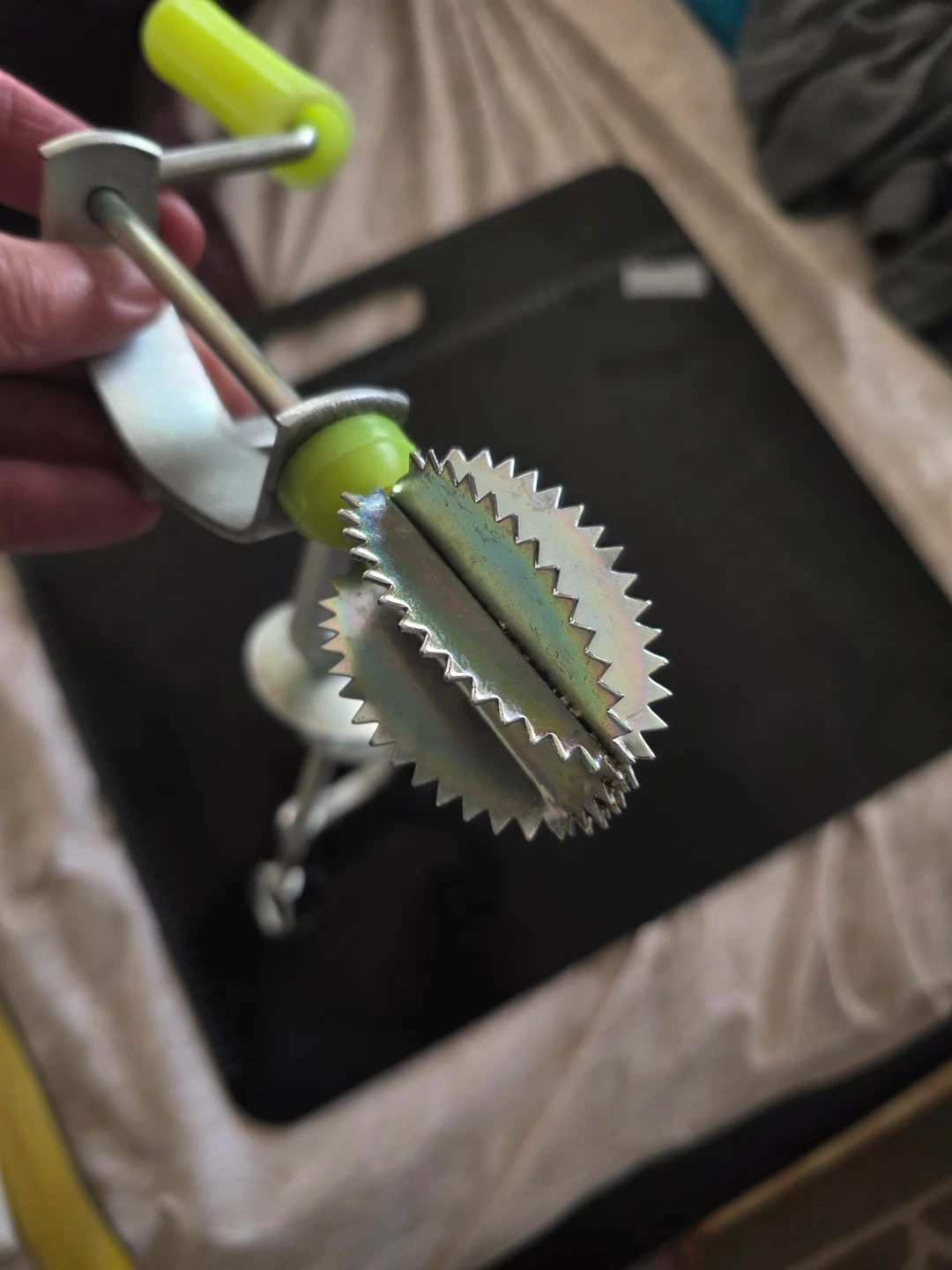 Design: Features a serrated blade at the end of a long metal arm, operated by turning a handle.