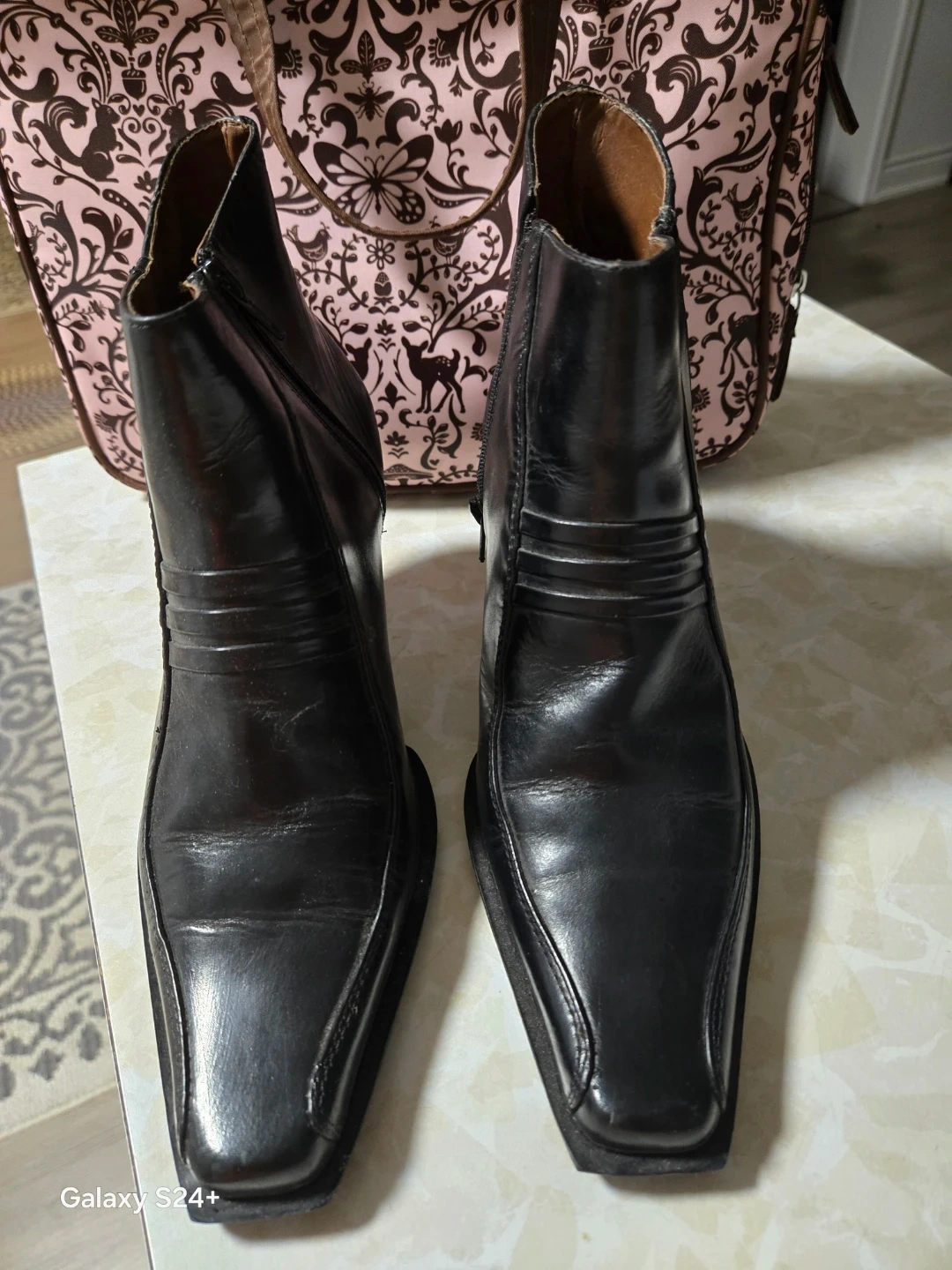 These black ankle boots are made of Napa leather with a Neolite sole. They feature a side zipper for easy wear. Size is 36, heel 5.5 high. Please mo texting before 8aam