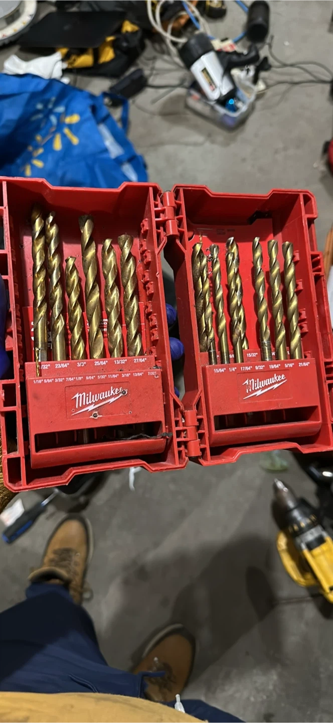 This is a Milwaukee drill bit set in a red carrying case. It's a collection of assorted drill bits with various sizes clearly marked. These bits are designed for drilling into different materials. A great addition for any toolbox!