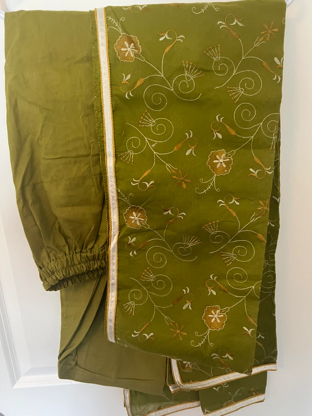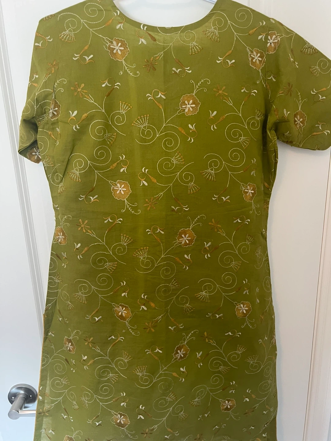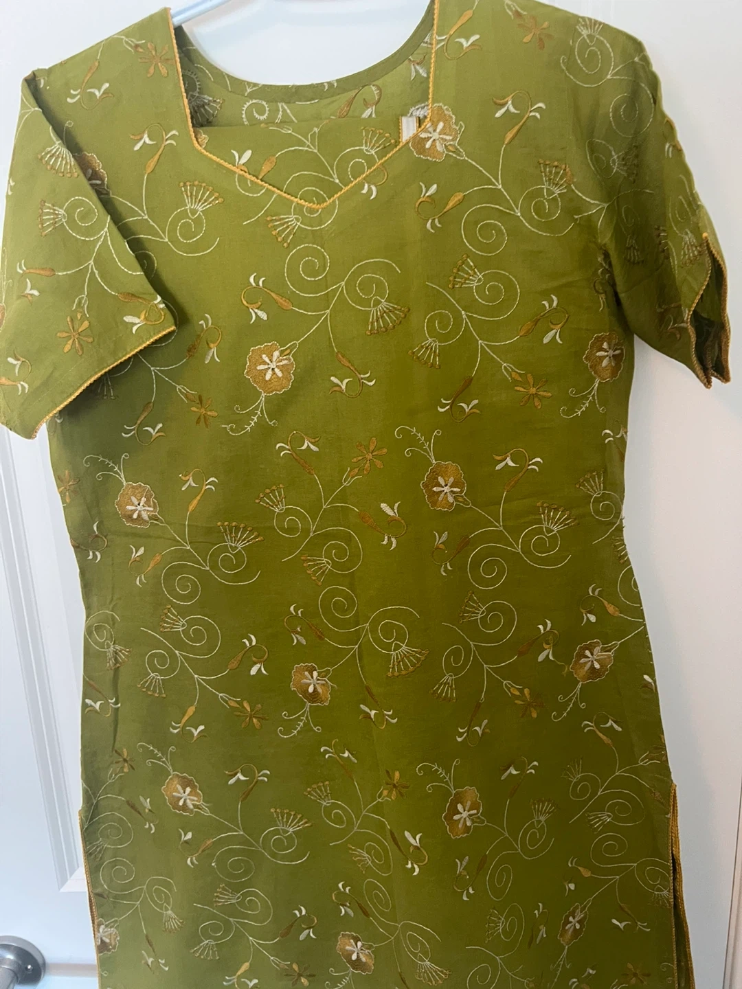 Lovely green kurti with intricate white and gold floral embroidery. Includes matching pants. Great for casual wear!