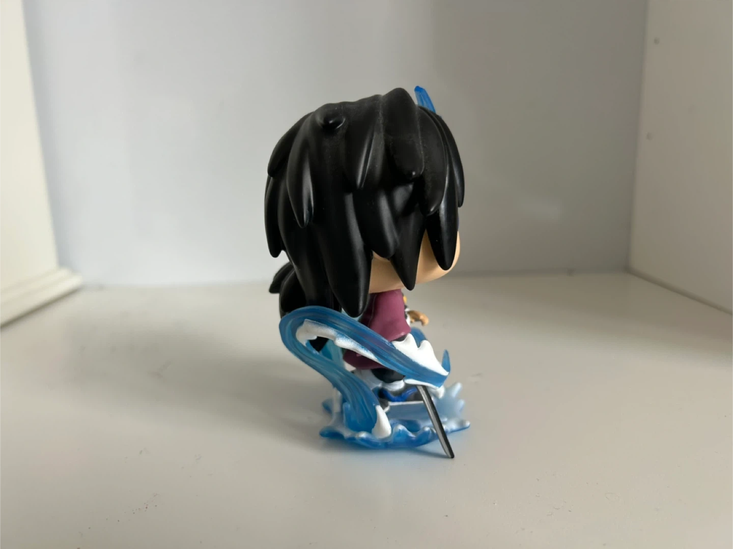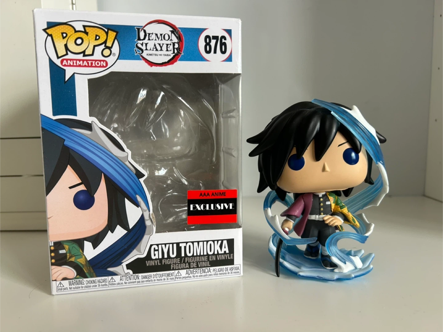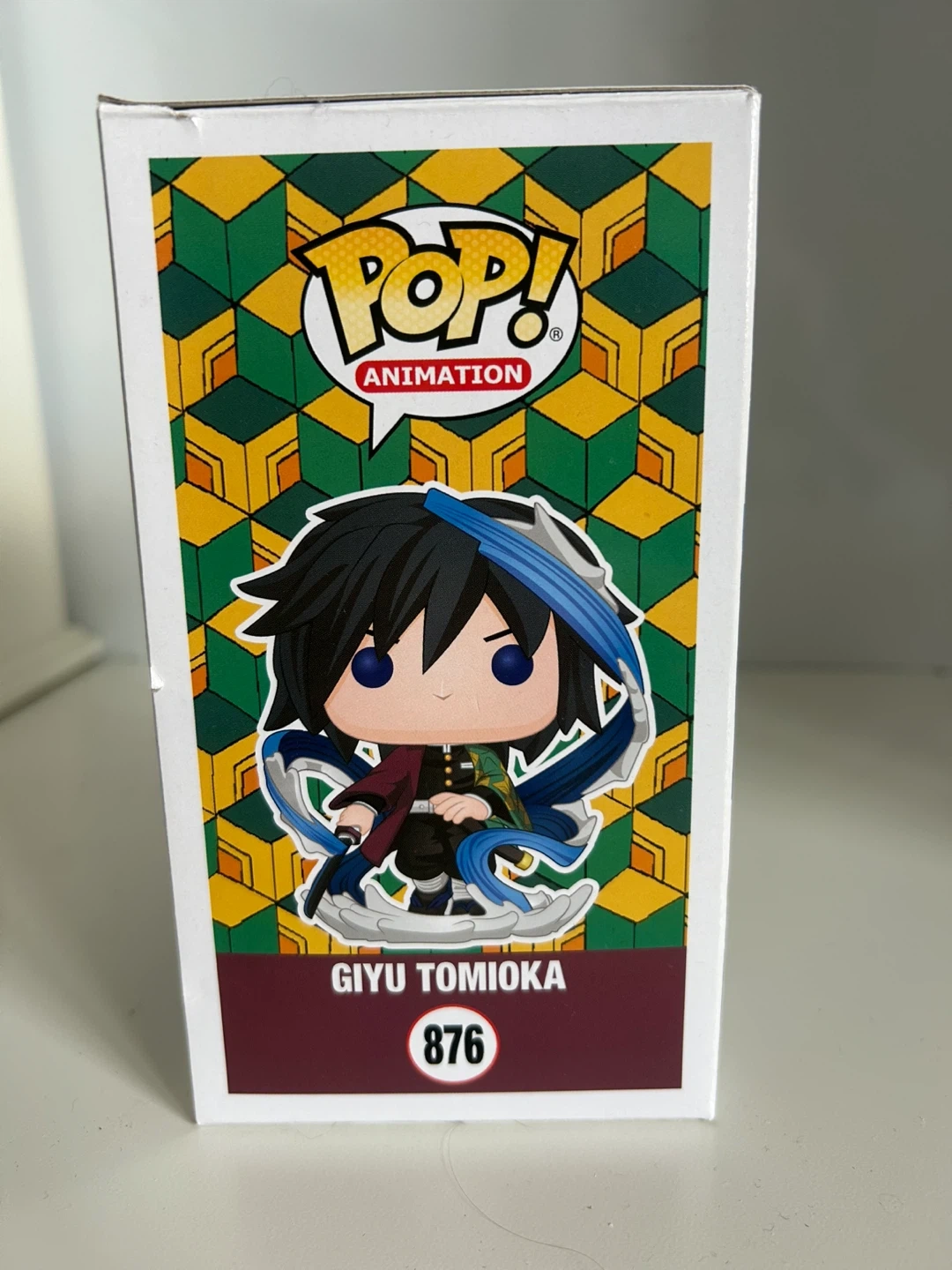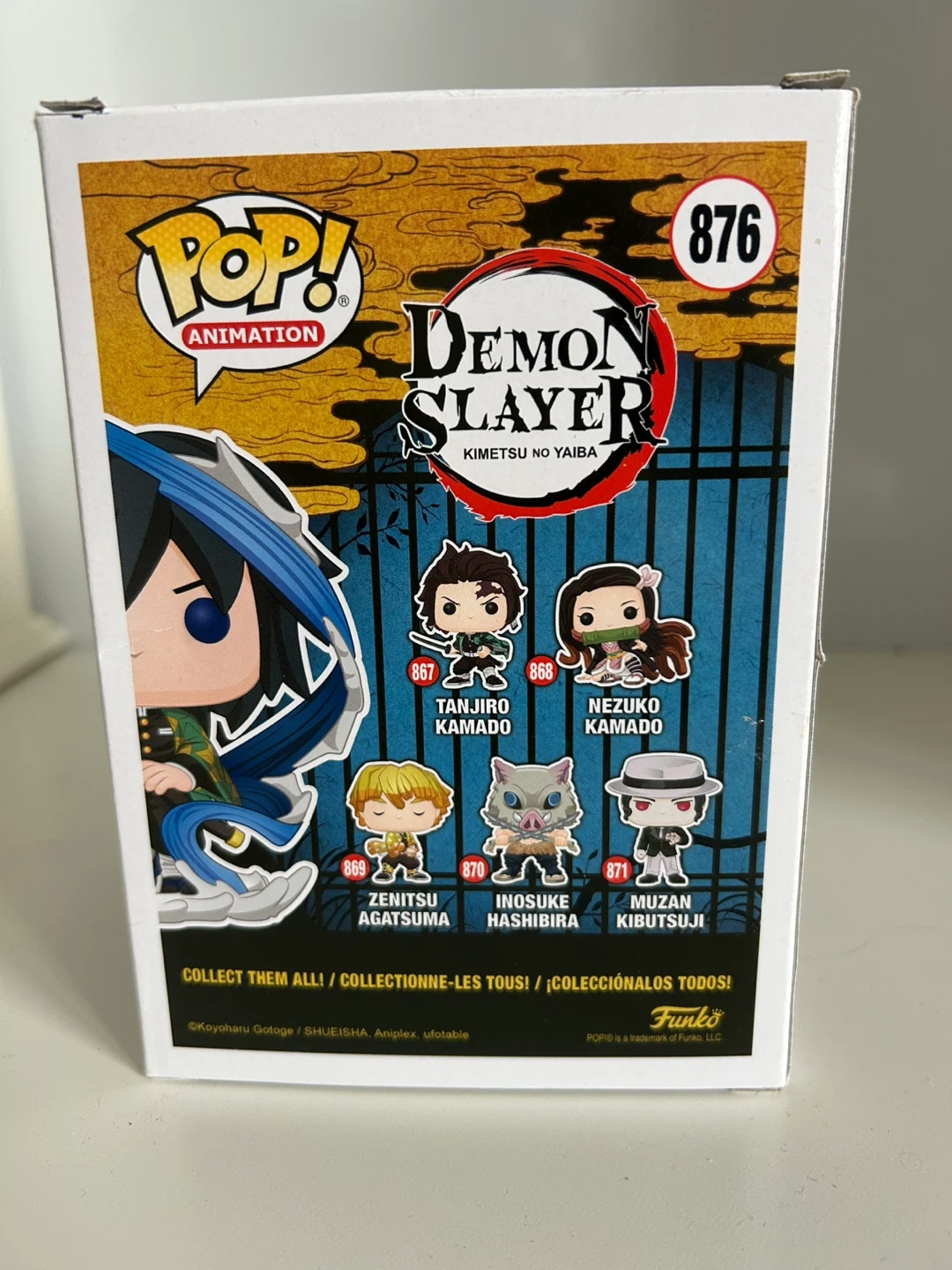 This is a Funko Pop! vinyl figure of Giyu Tomioka from Demon Slayer. It's figure #876 and comes with its original box. The figure depicts Giyu in his iconic pose with water effects.