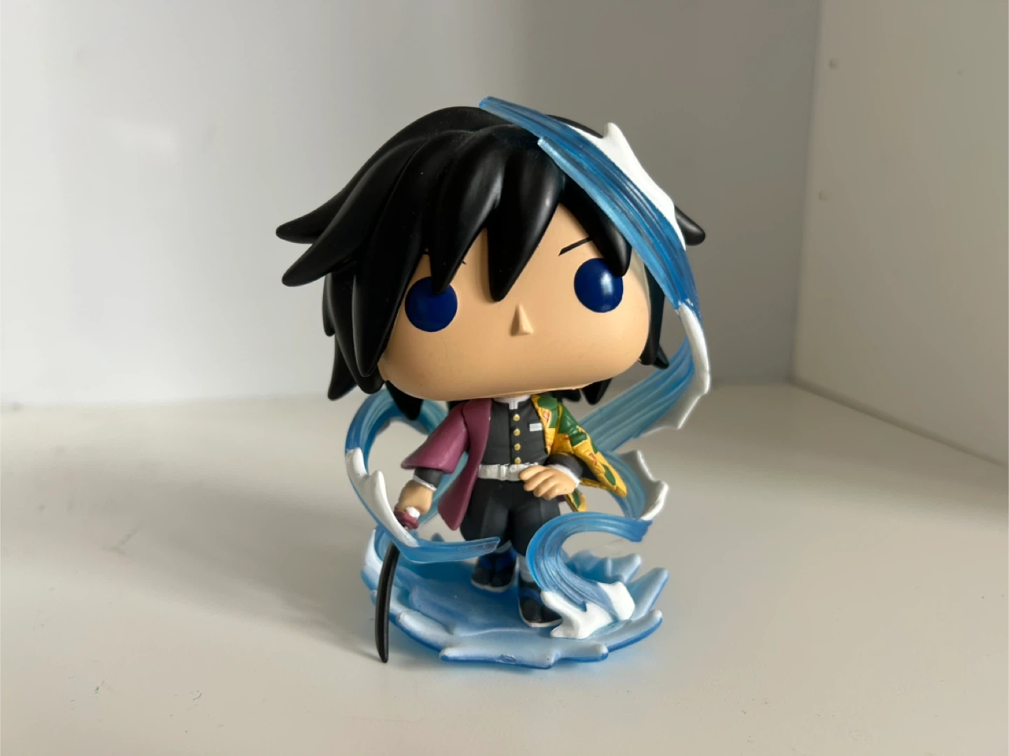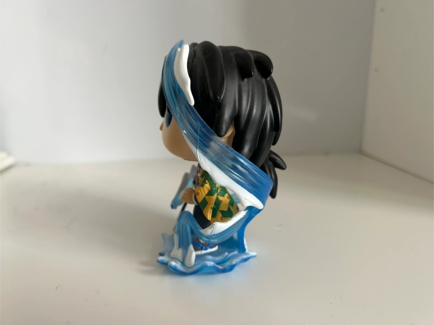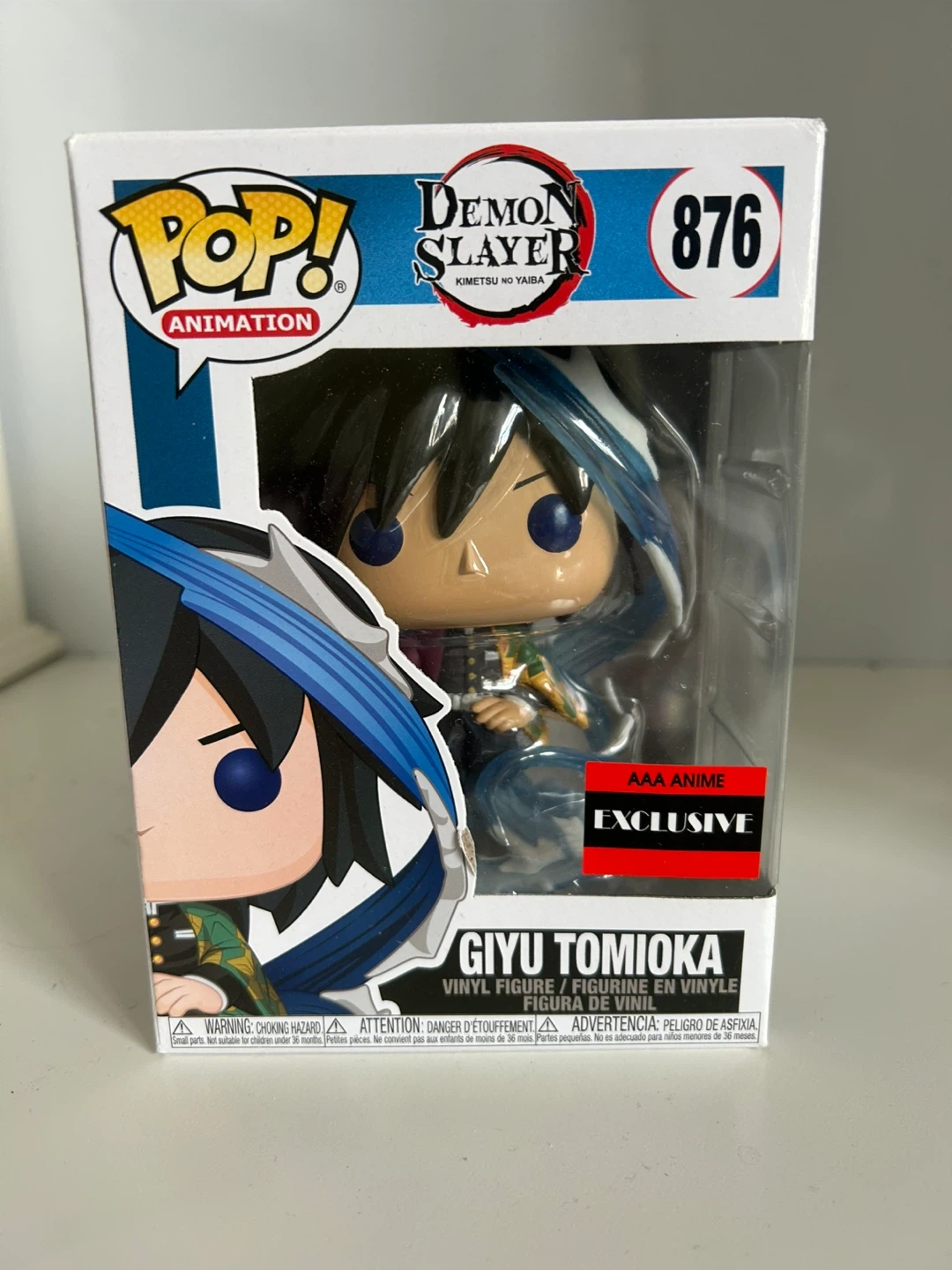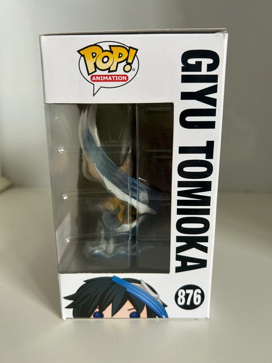 This is a Funko Pop! vinyl figure of Giyu Tomioka from Demon Slayer. It's figure #876 and comes with its original box. The figure depicts Giyu in his iconic pose with water effects.