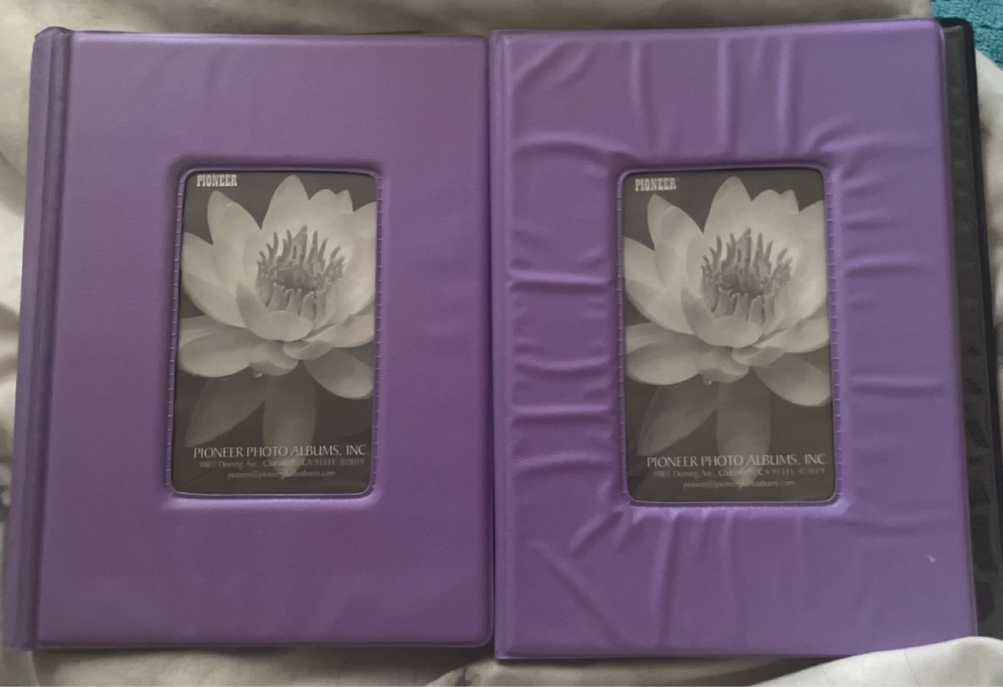 This is two photo album in a bright purple color. It features a clear window on the front cover for a personalized photo. Only holds 24 pictures up to 4X6. I brought 5 and only ended up using 3 so I am selling them 3 dollars each!