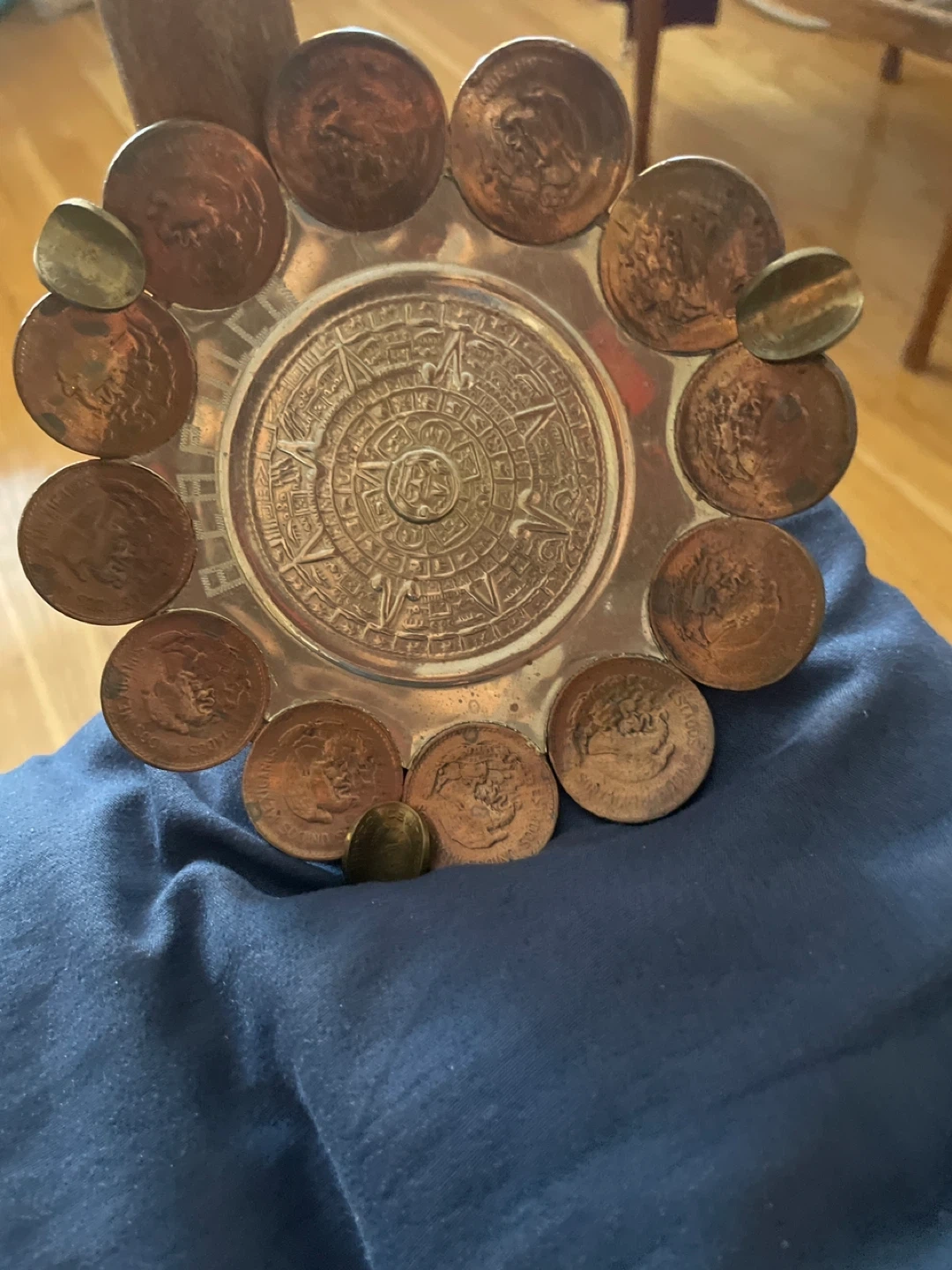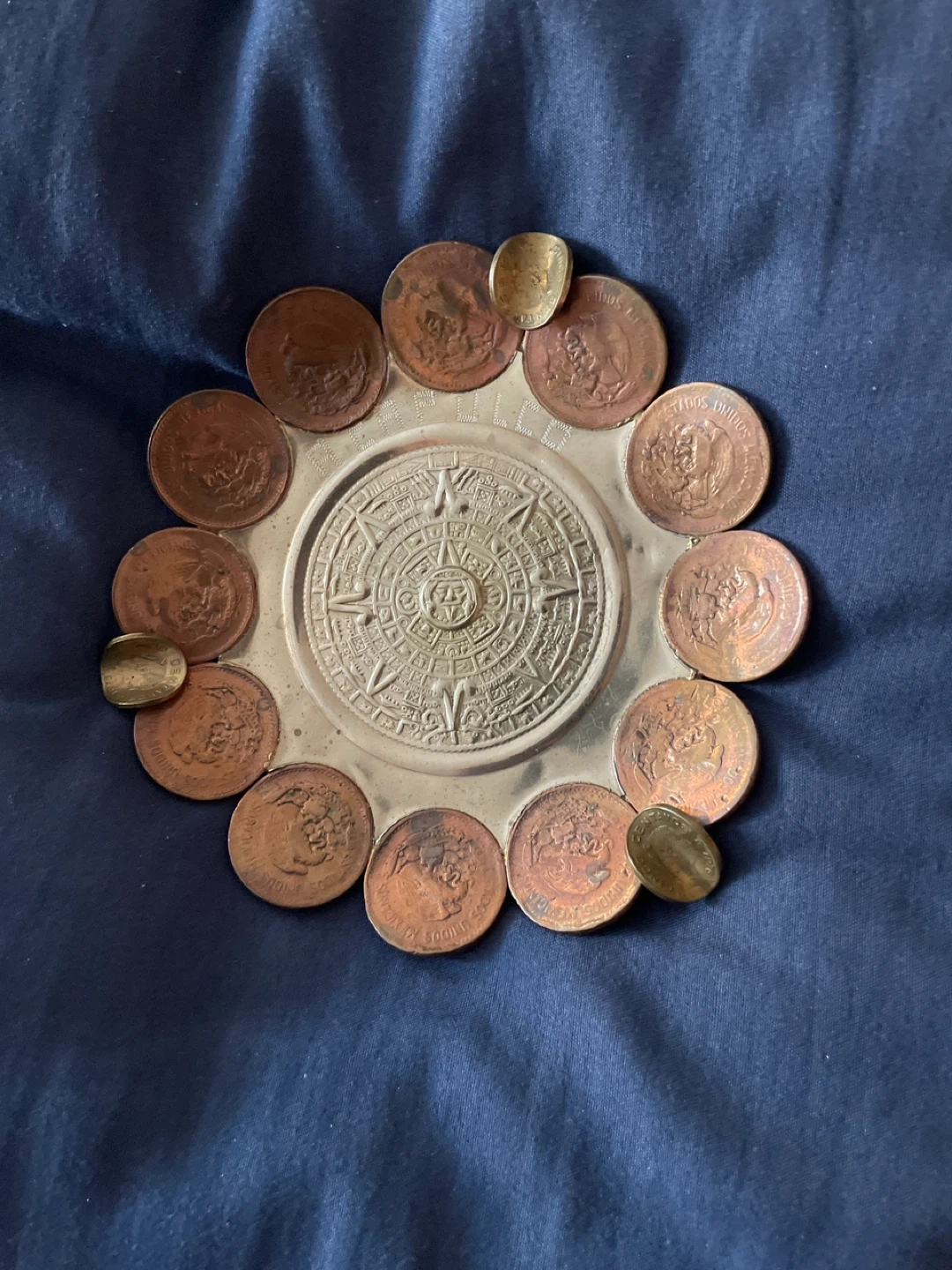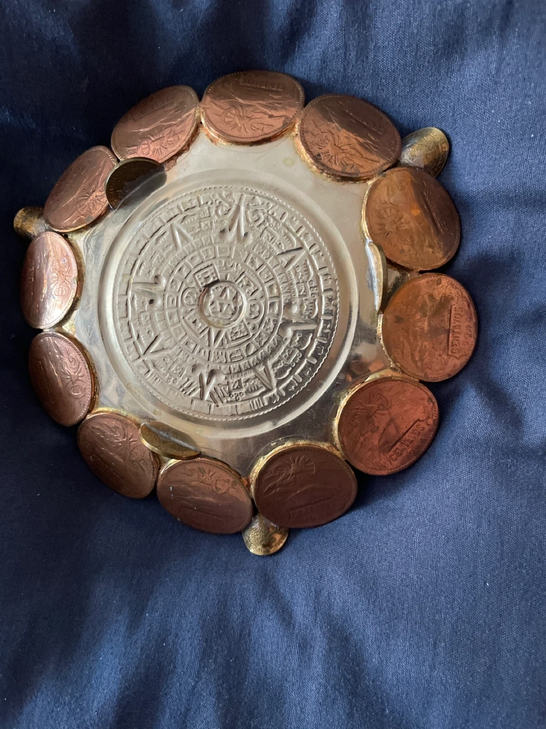 This decorative dish features an embossed Aztec calendar design at its center. It's surrounded by a border of various coins. This unique piece adds a touch of history to any space!