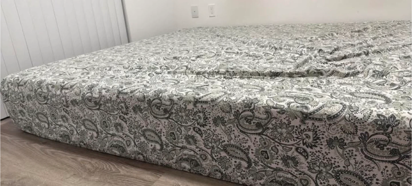 King size mattress featuring a green and white paisley patterned cover. It's a standard mattress, suitable for a King bed frame. Memory foam gel mattress.