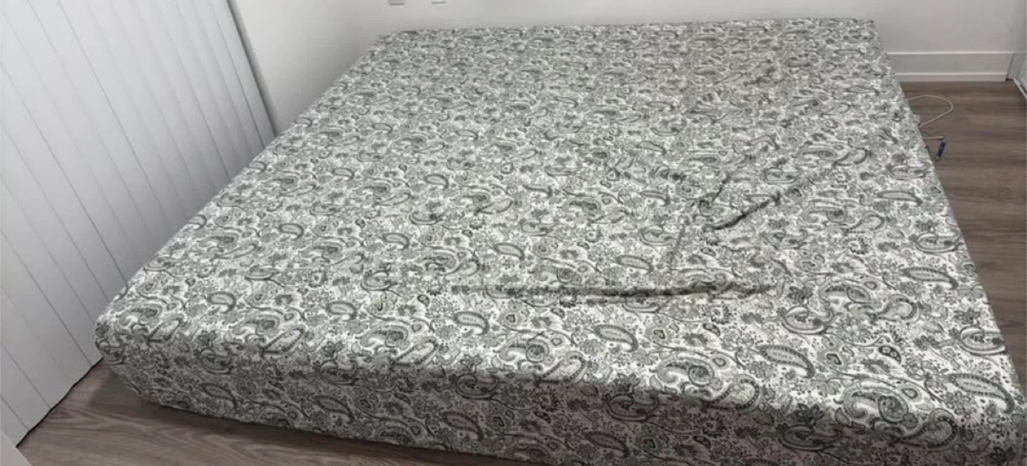 King size mattress featuring a green and white paisley patterned cover. It's a standard mattress, suitable for a King bed frame. Memory foam gel mattress.