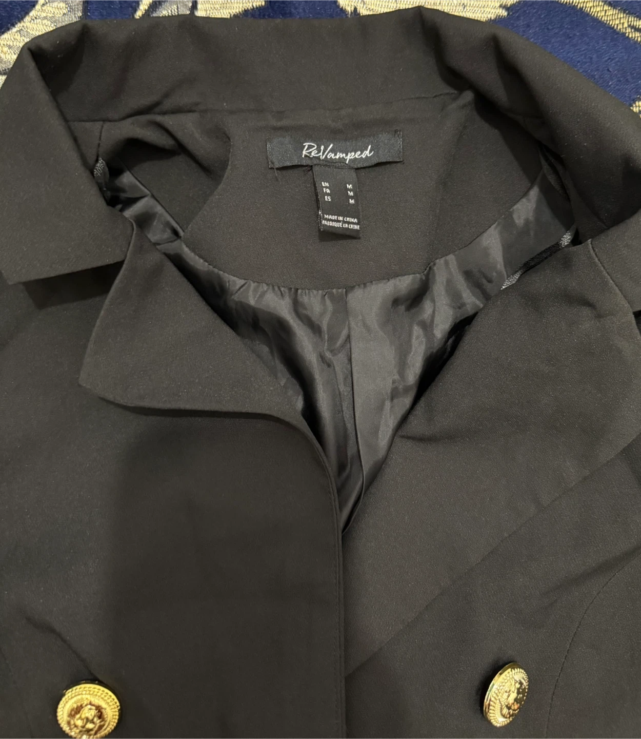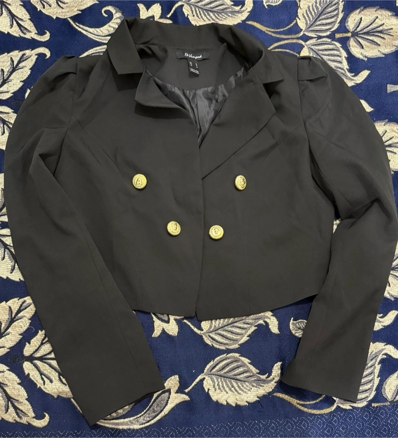 Selling a stylish black cropped blazer from Revamped in size medium! It features a double-breasted design with gold buttons. The style number is SS40-848. This blazer is perfect for adding a touch of sophistication to any outfit!