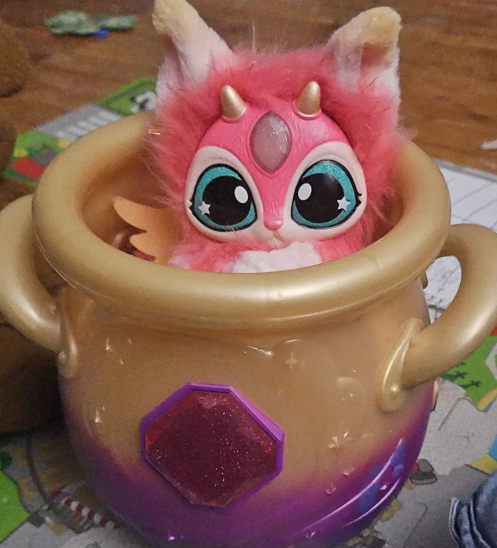 I'm selling a Magic Mixies Pixlings Potion toy! This cute pink creature comes in a golden cauldron. It's in great condition and ready for a new home!