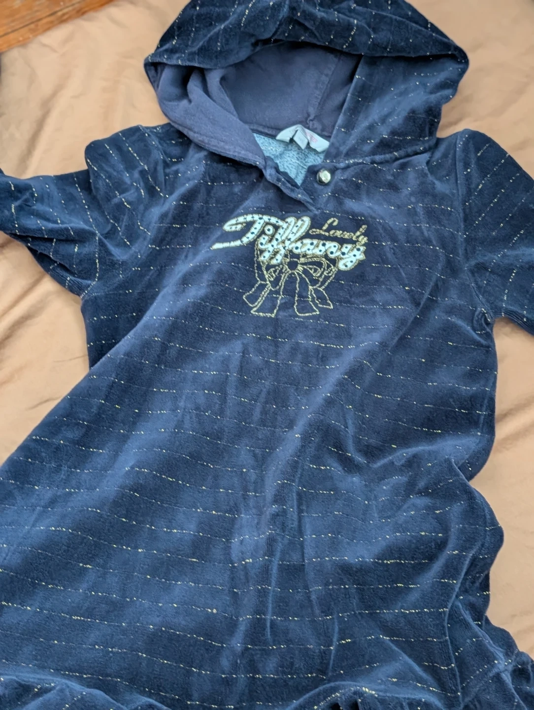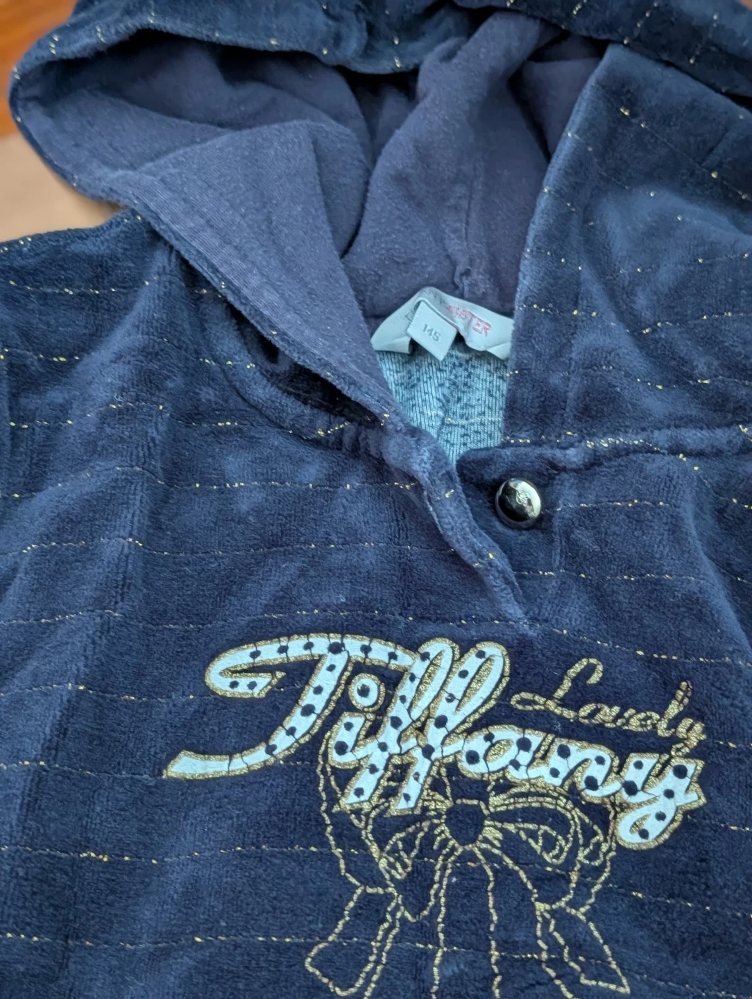 This is a navy velour hoodie for teens. It features gold glitter stripes throughout and a "Tiffi & Lovely" graphic with a bow on the front. A single button closure at the neck. Size 7y