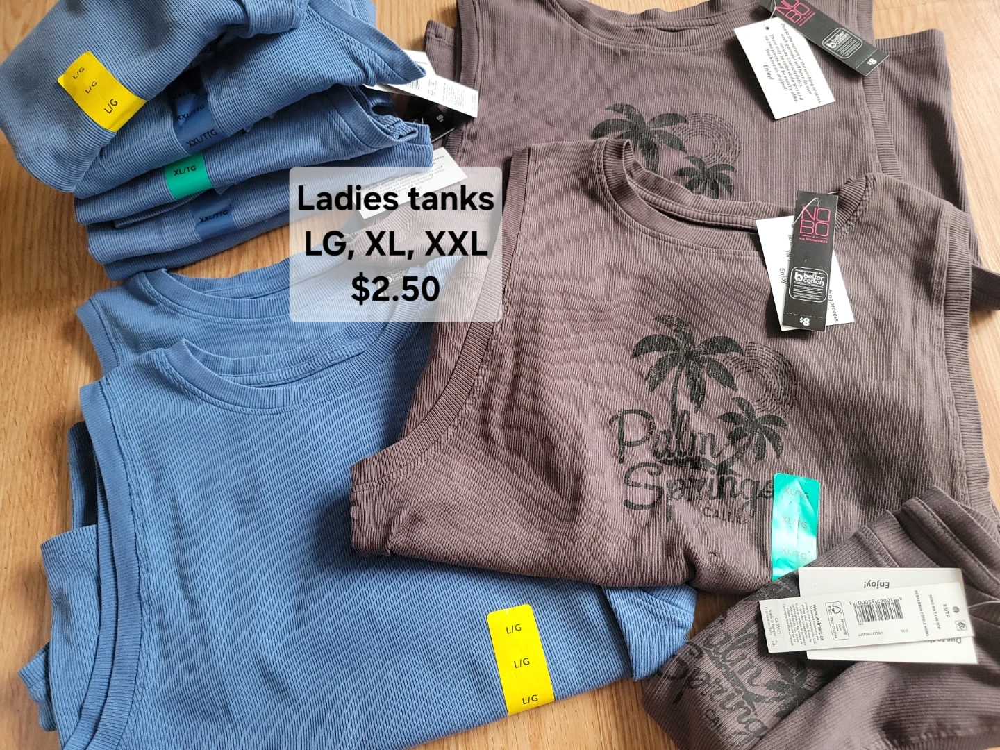 includes men's sizes sm, med, LG, XL, XXL and ladies sizes xs, sm, med, LG, XL, XXL. Clothing types vary from t-shirts, tanks, thermals, loungewear, and pyjamas. Most items still have tags attached.