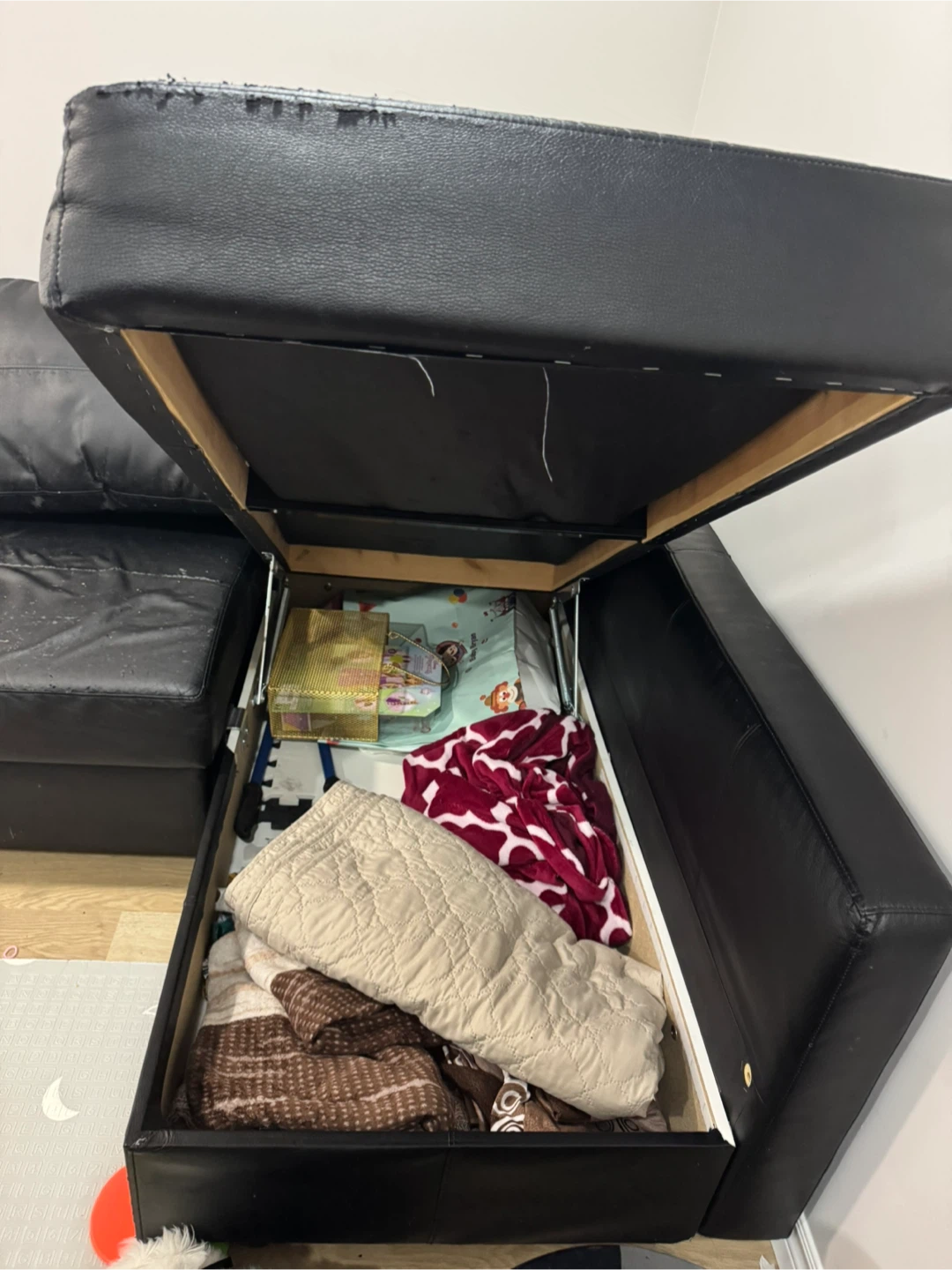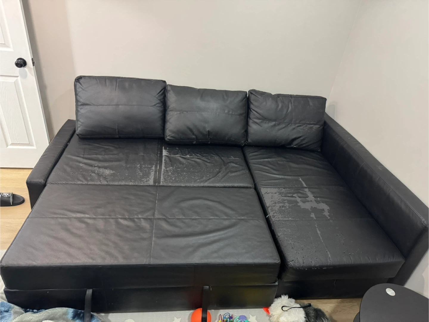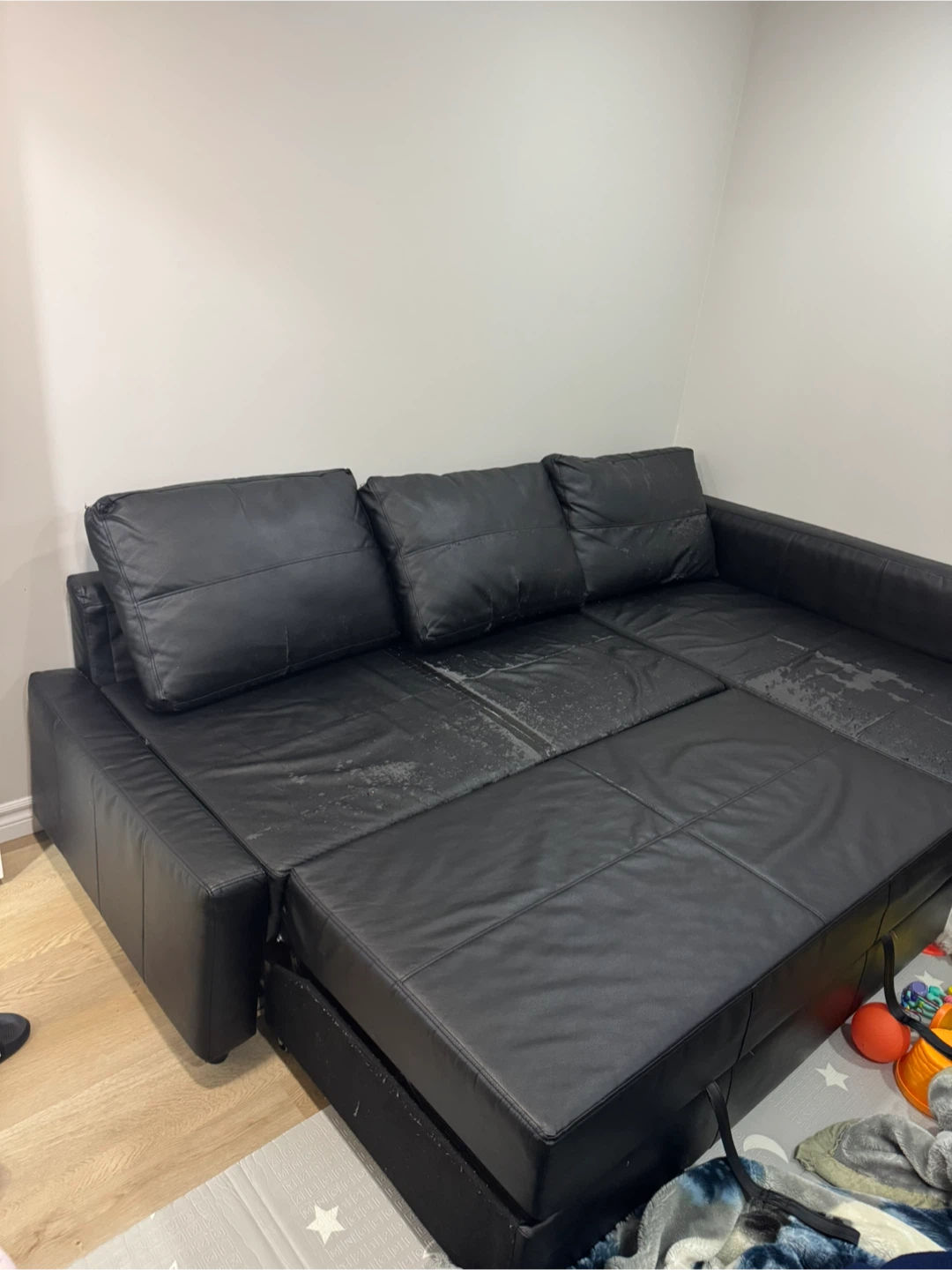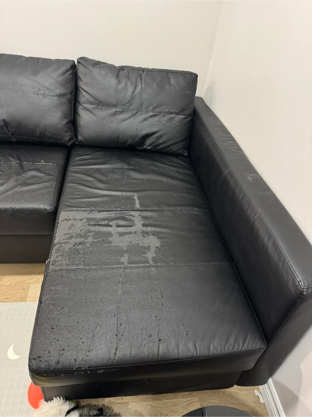 This is a black faux leather sectional sofa. It features a chaise lounge with built-in storage underneath. The material shows wear and peeling, especially on the seating areas. Some cushions are included.