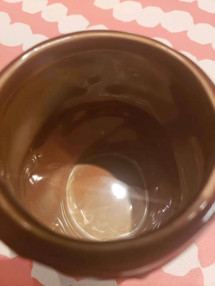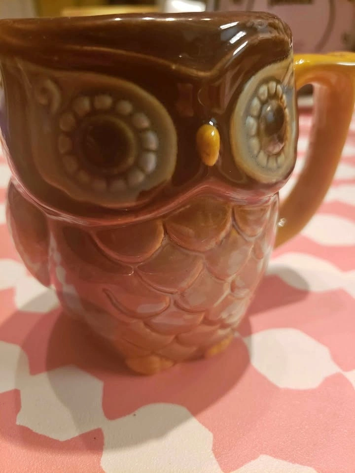 Cute little painted brown owl mug with green eyes and yellow wings and handle. 4 inches high. Hardly used, mostly stored in cupboard. No chips, cracks, or marks. Pretty colours and nice detail in the feathers and around the eyes.