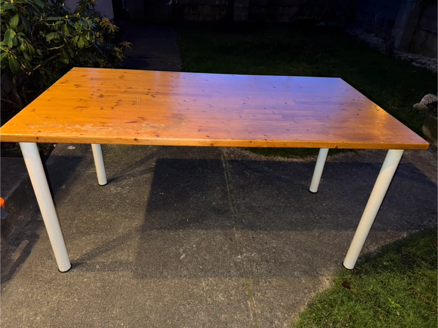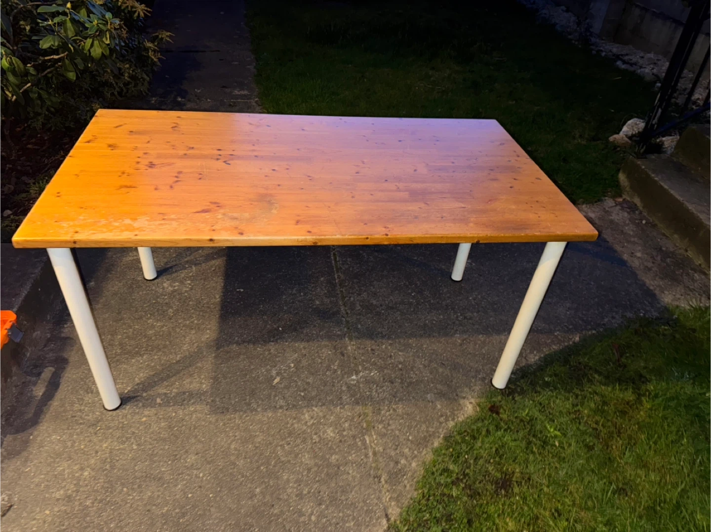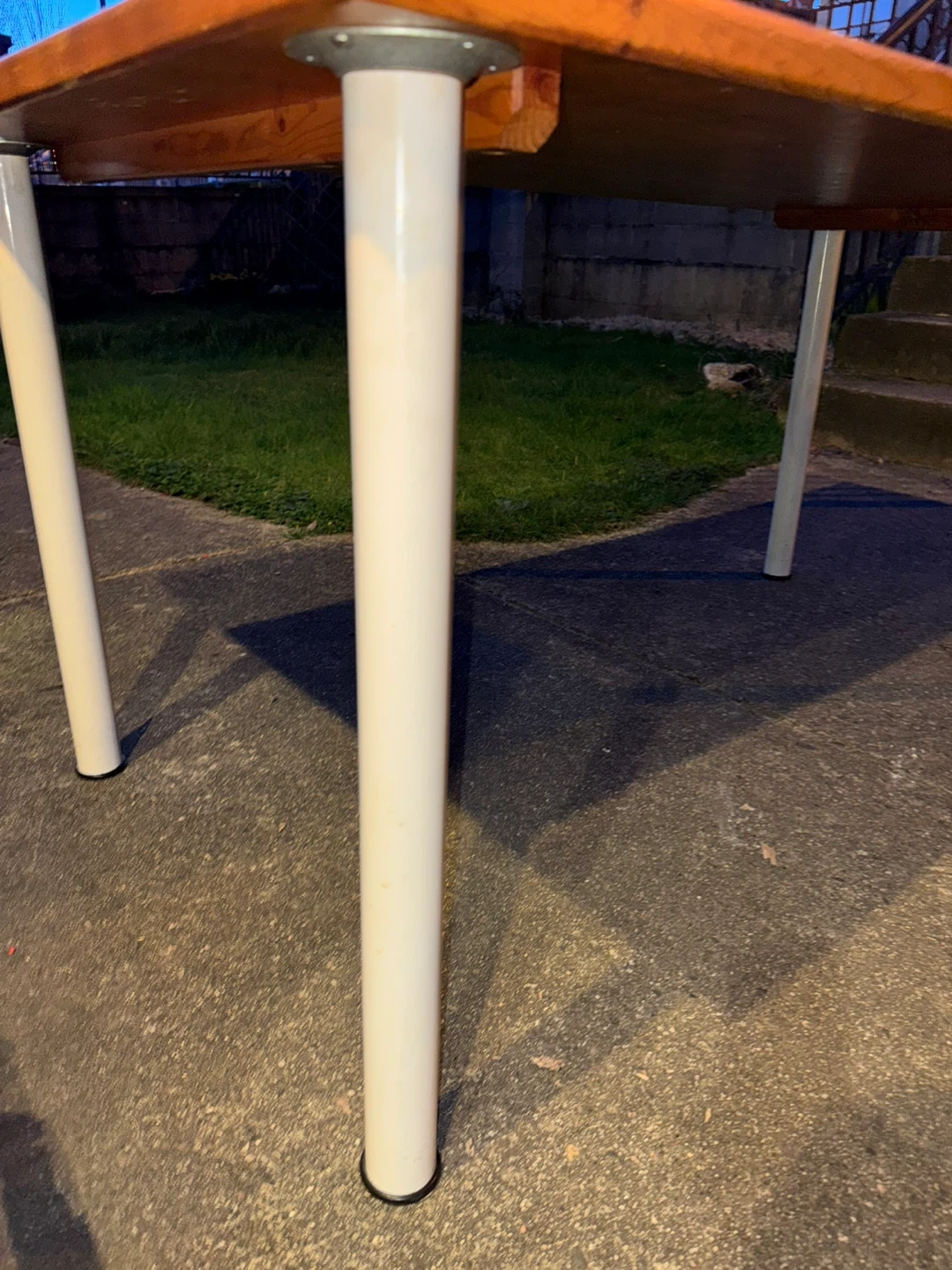 A sturdy wooden table with a warm orange-toned finish. It's supported by four white metal legs. This table's simple design makes it versatile for various uses.