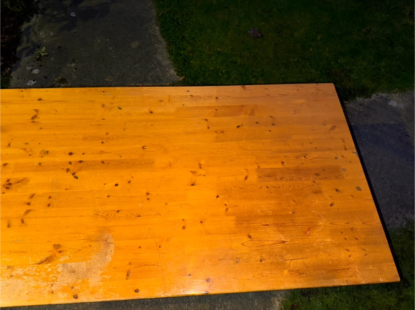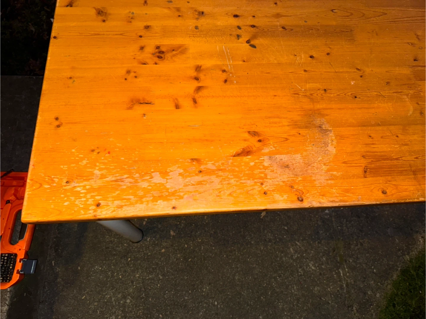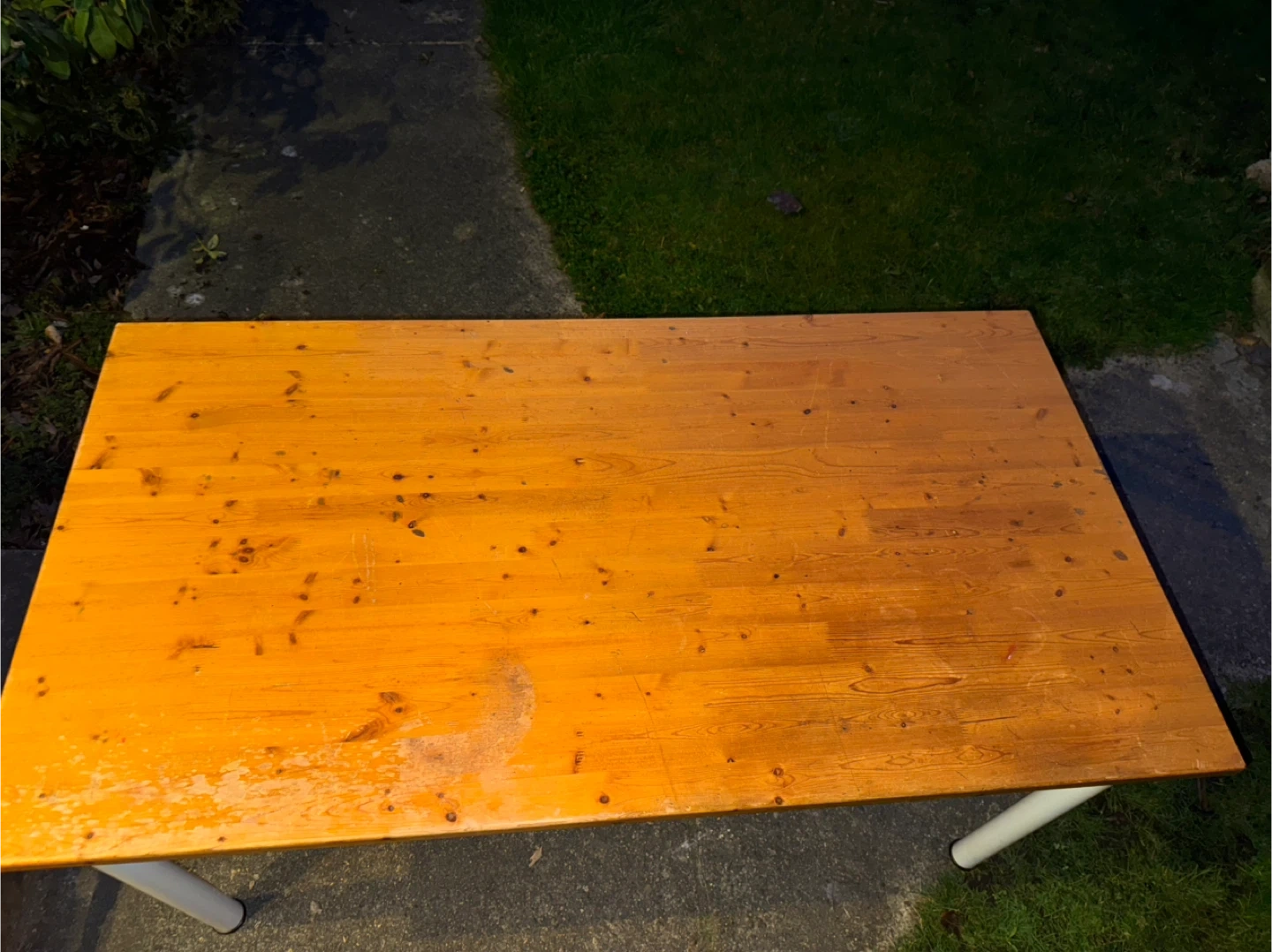 A sturdy wooden table with a warm orange-toned finish. It's supported by four white metal legs. This table's simple design makes it versatile for various uses.