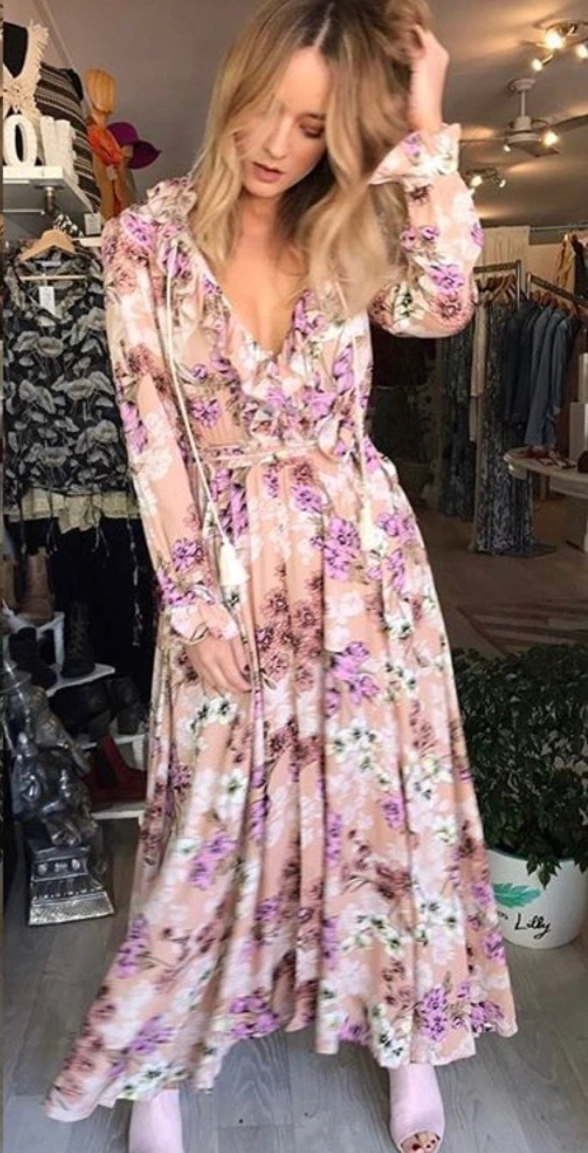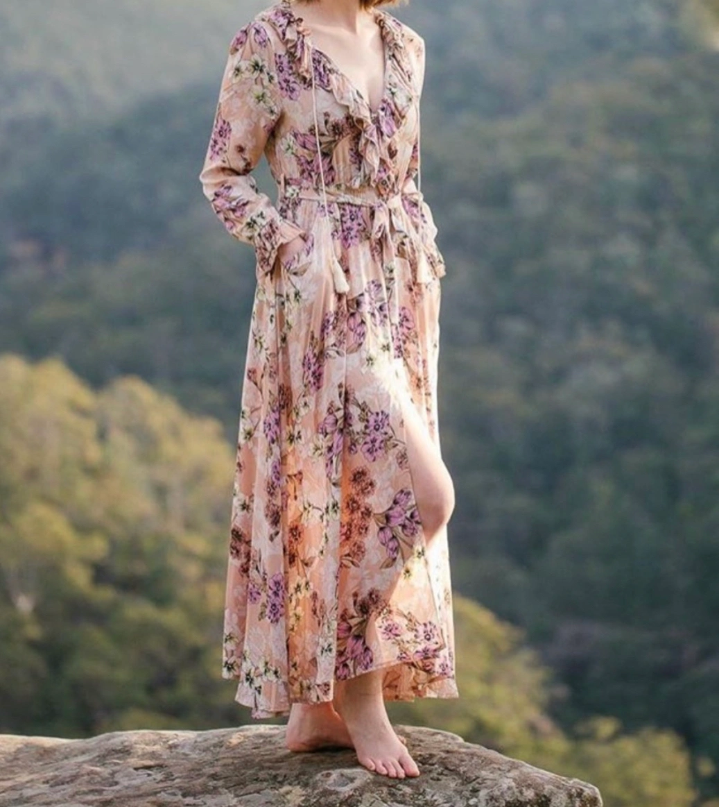 Beautiful floral bohemian dress! Totally rare and boho / festival perfect!!! Material is rayon and it's amazingly soft! Gorgeous Maxi Dress featuring long sleeves, Elastic Waist, button down front, full length maxi