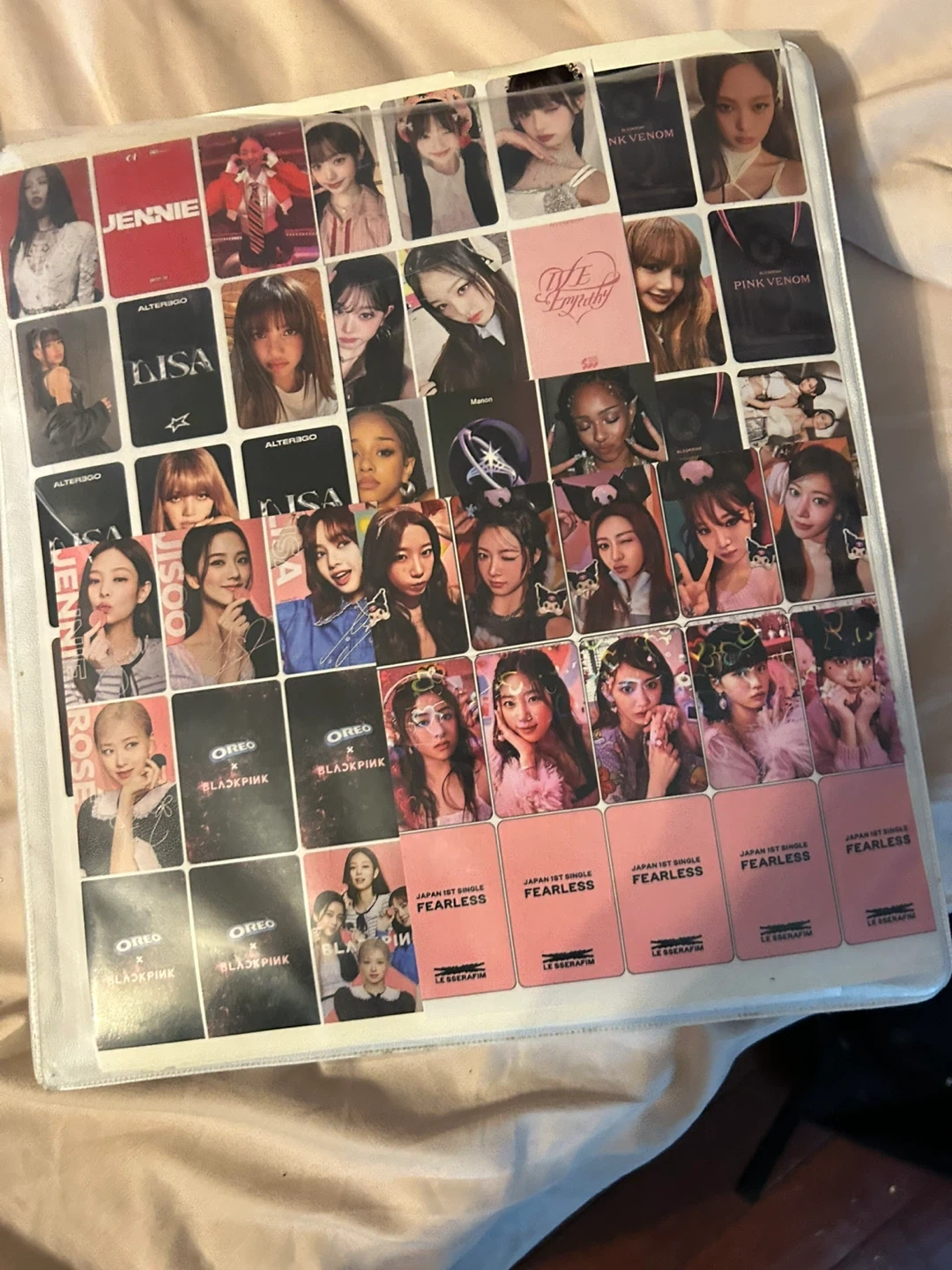 Collection of photocards from LE SSERAFIM's Japan 1st Single 'Fearless'. Features members like Sakura, Chaewon, Yunjin, Kazuha, and Eunchae. Also includes photocards related to BLACKPINK's 'Pink Venom' era and individual member cards.