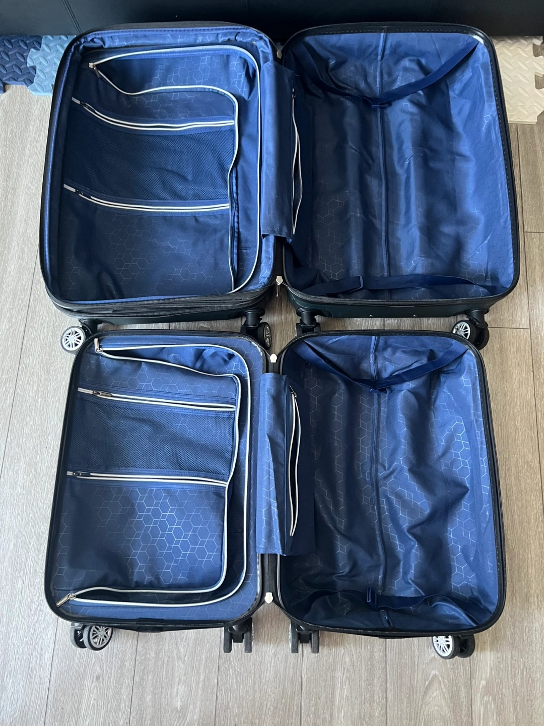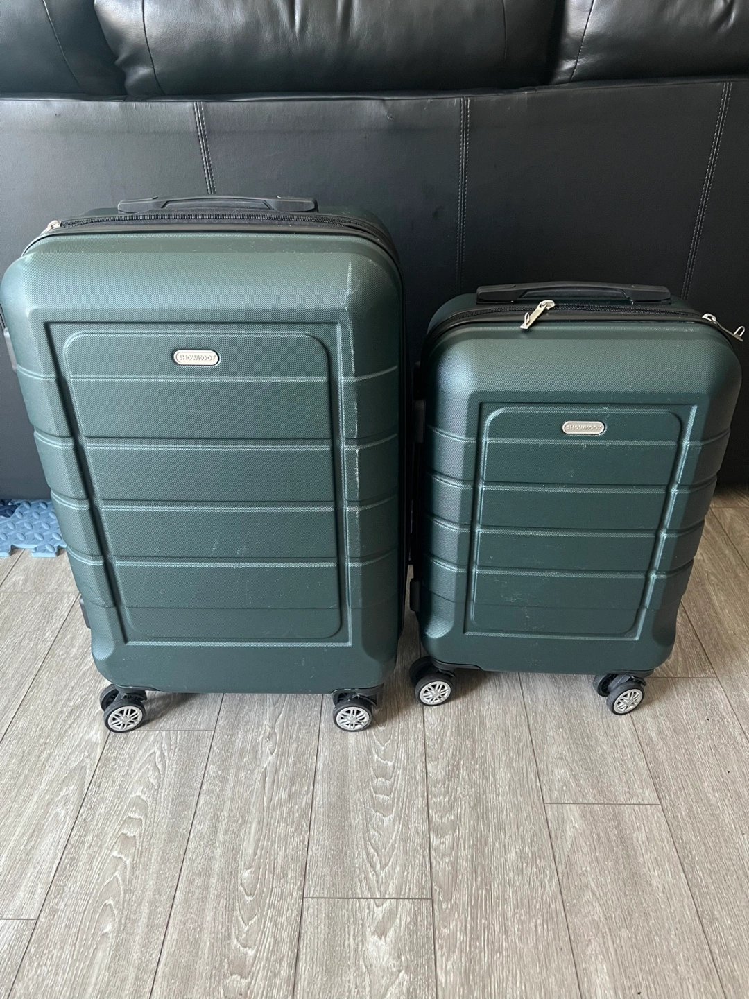 Dark teal green hard shell suitcases. Two pieces, one larger and one smaller carry on. TSA approved combination locks. Spinner wheels. Interior features include zippered compartments and tie-down straps.