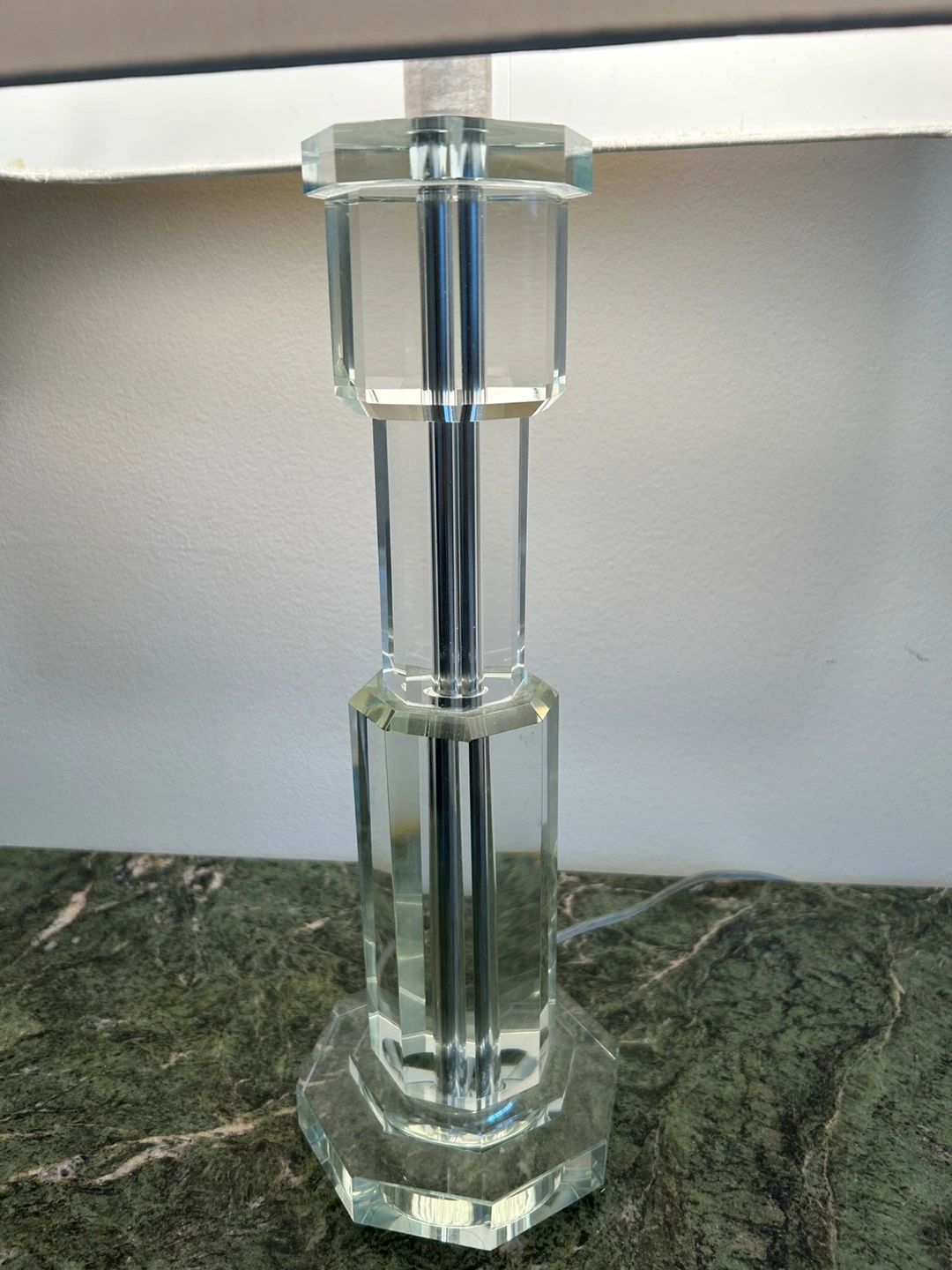 A stylish table lamp with a faceted crystal base. It comes with a rectangular white lampshade. Perfect for adding a touch of elegance to any room!