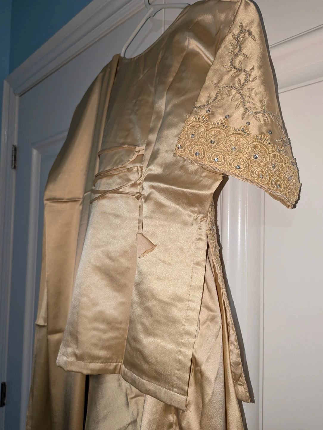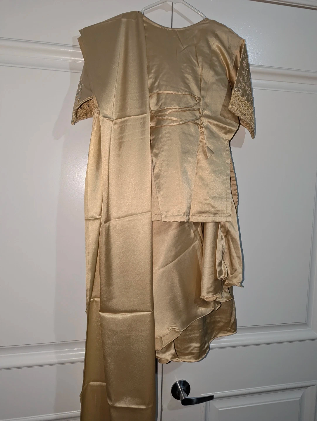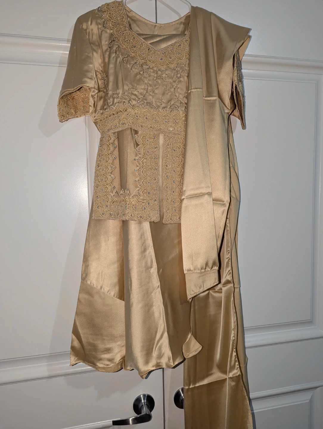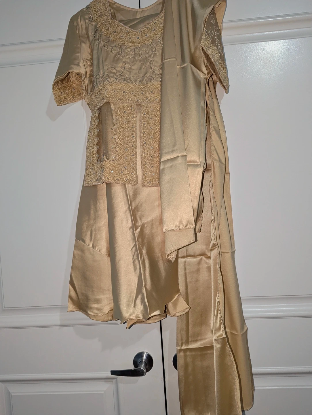 This gold satin kurti comes with a matching dupatta and features delicate lace and beadwork on the neckline and sleeves. It's made from a smooth, shimmering satin material. The set is perfect for festive occasions.