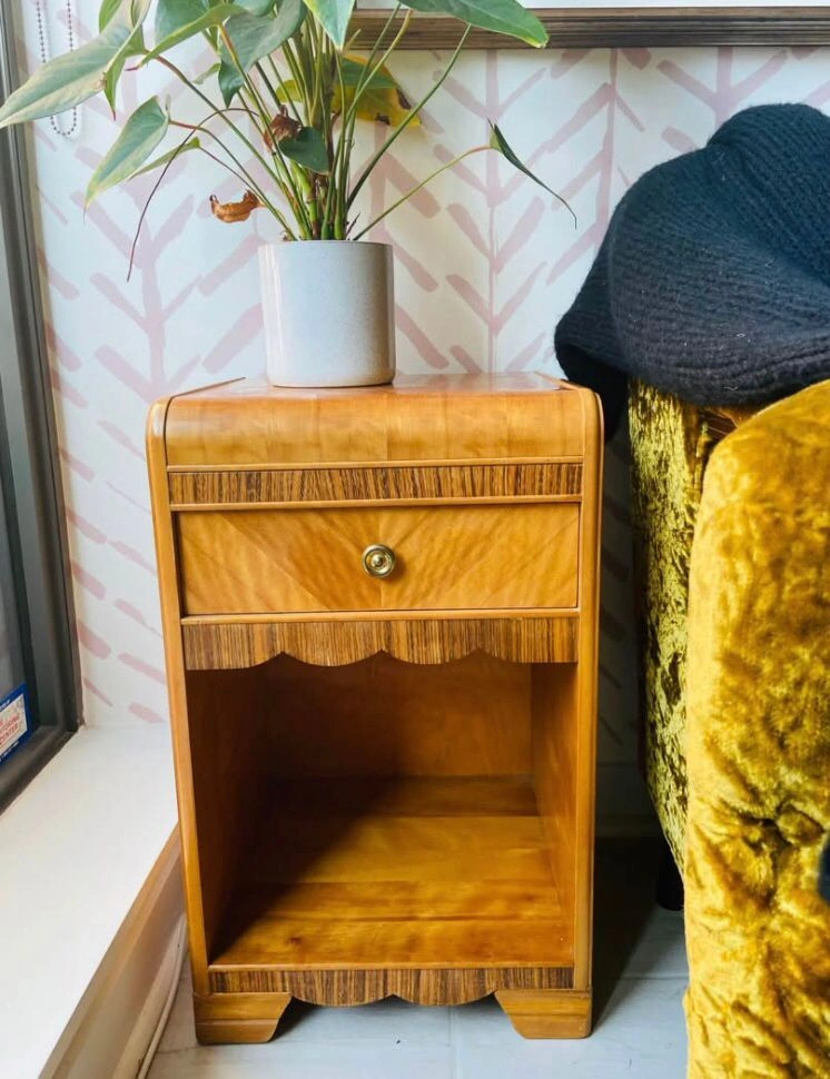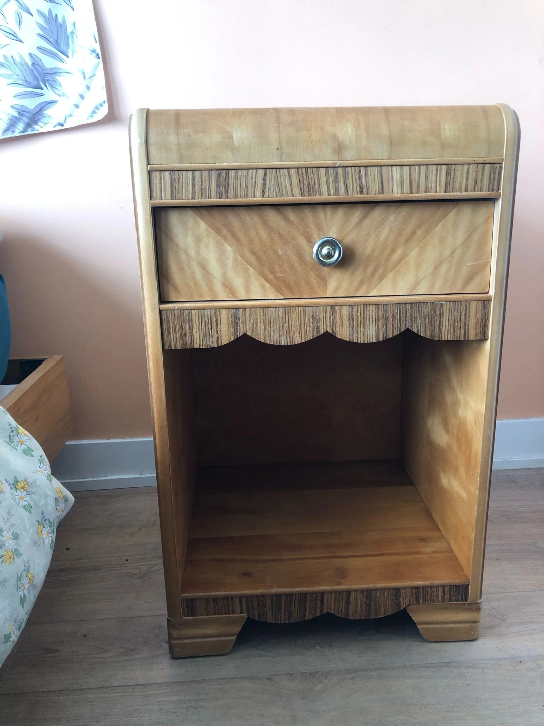 Vintage 1940s side table with waterfall edge and pretty scalloped detail. Some refinishing needed on top.