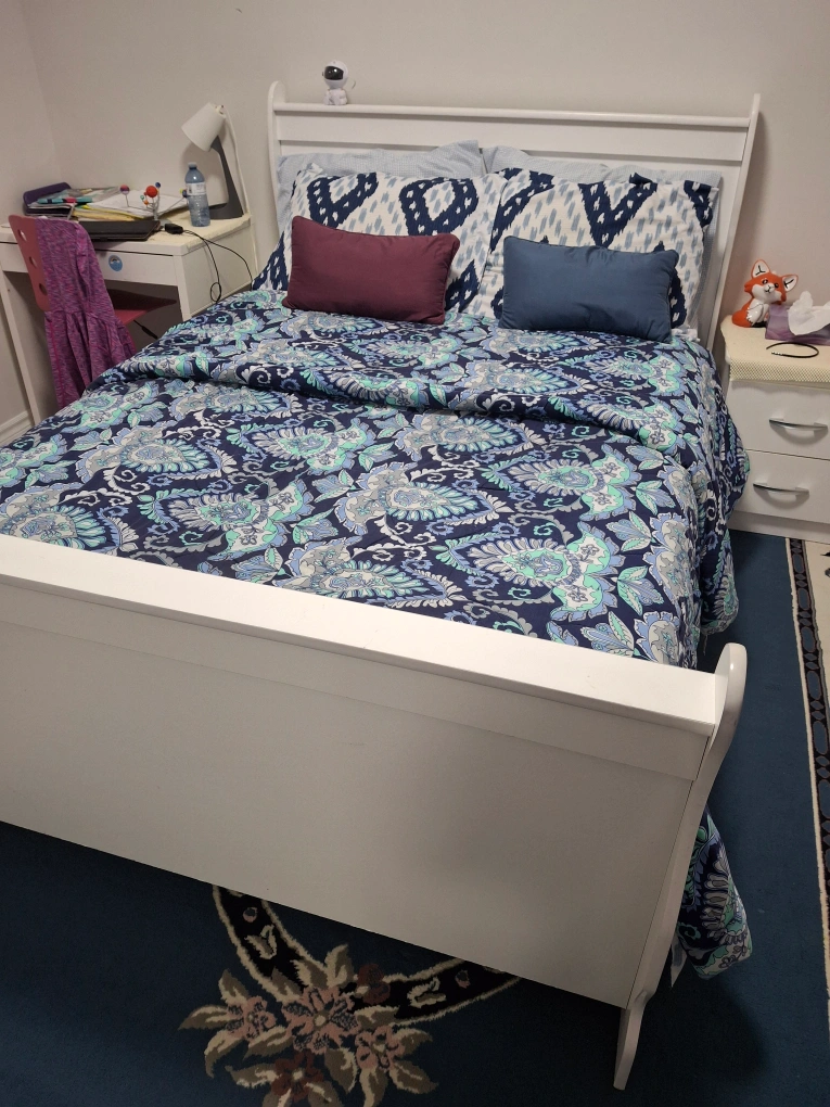 Selling a bedroom set double size that includes a bed frame, nightstand, and dresser. The set is white. Perfect for a bedroom makeover!