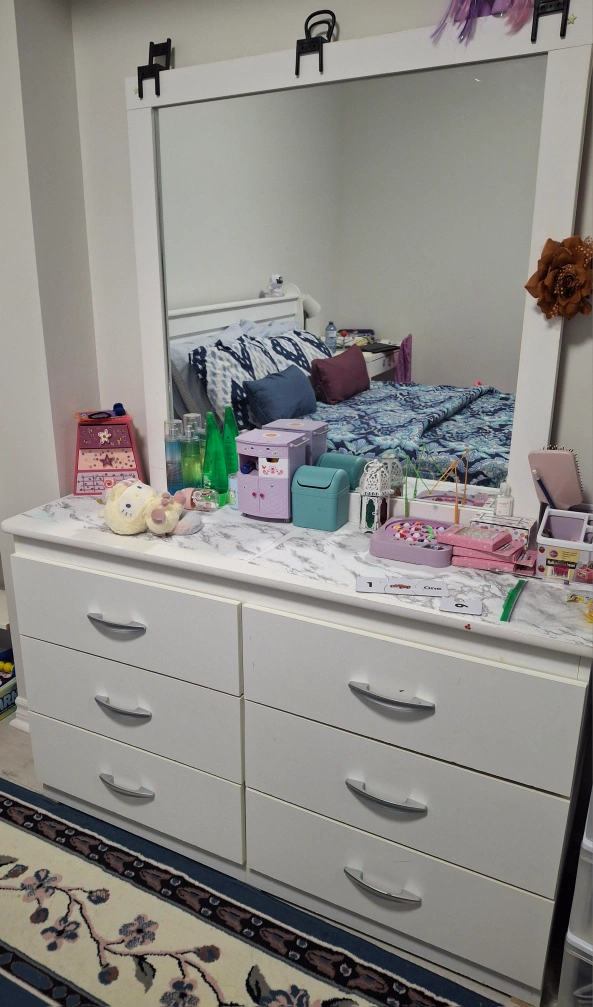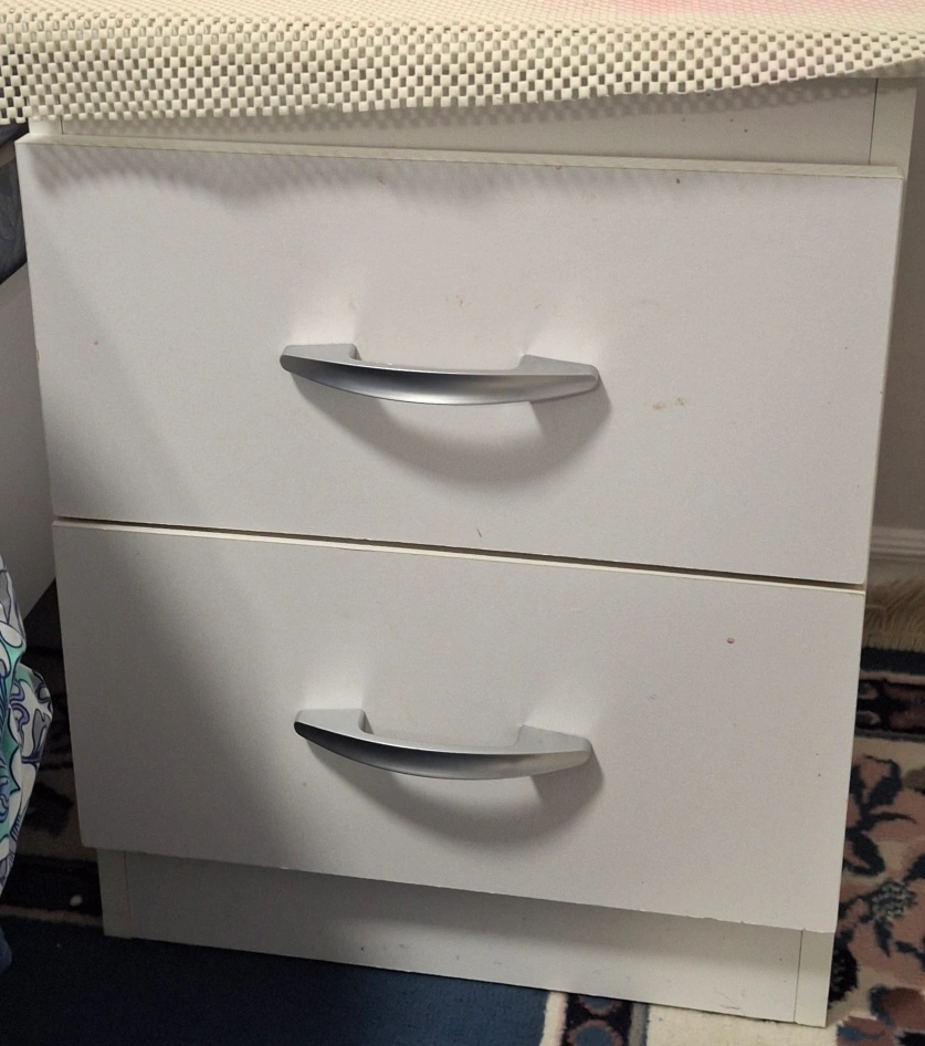 Selling a bedroom set double size that includes a bed frame, nightstand, and dresser. The set is white. Perfect for a bedroom makeover!