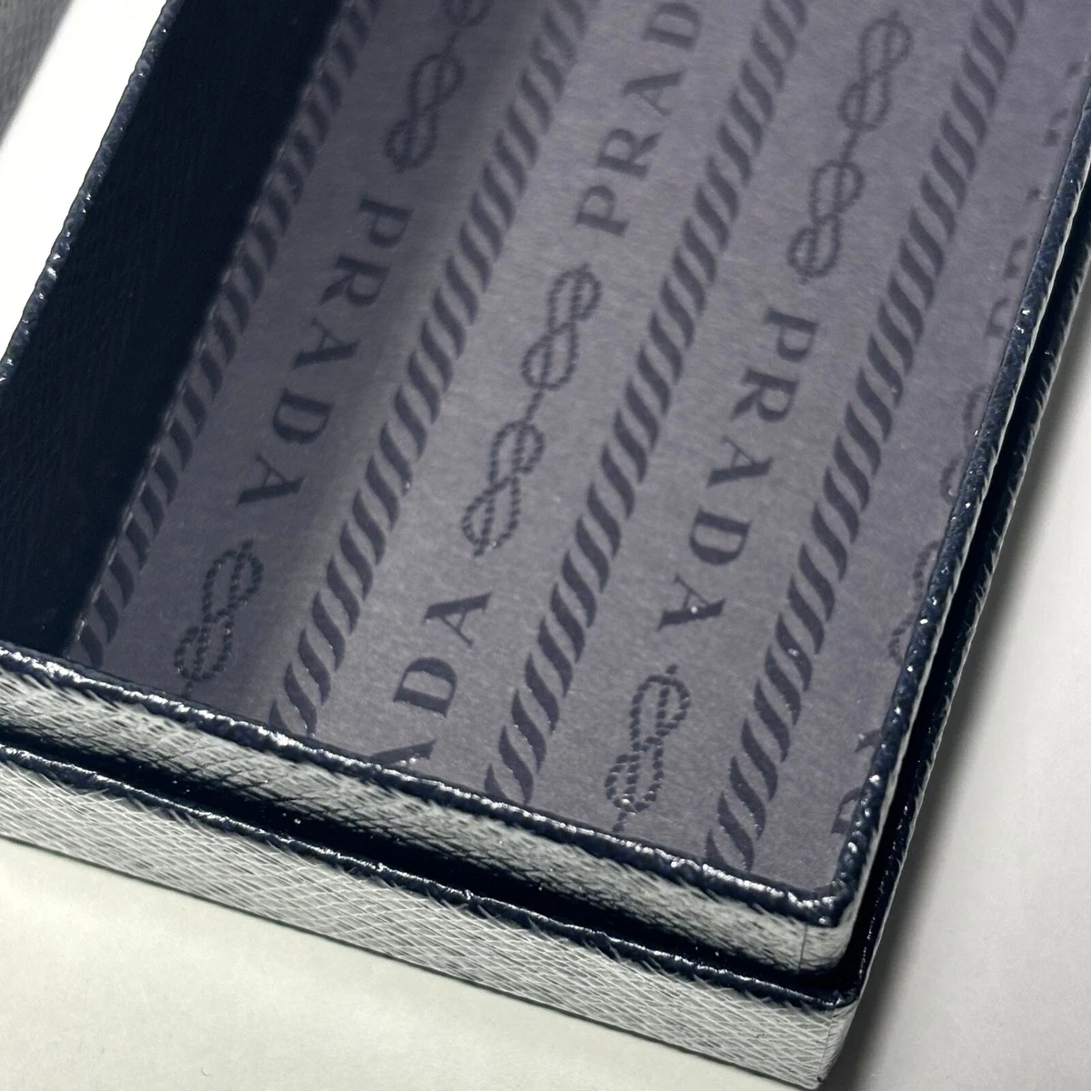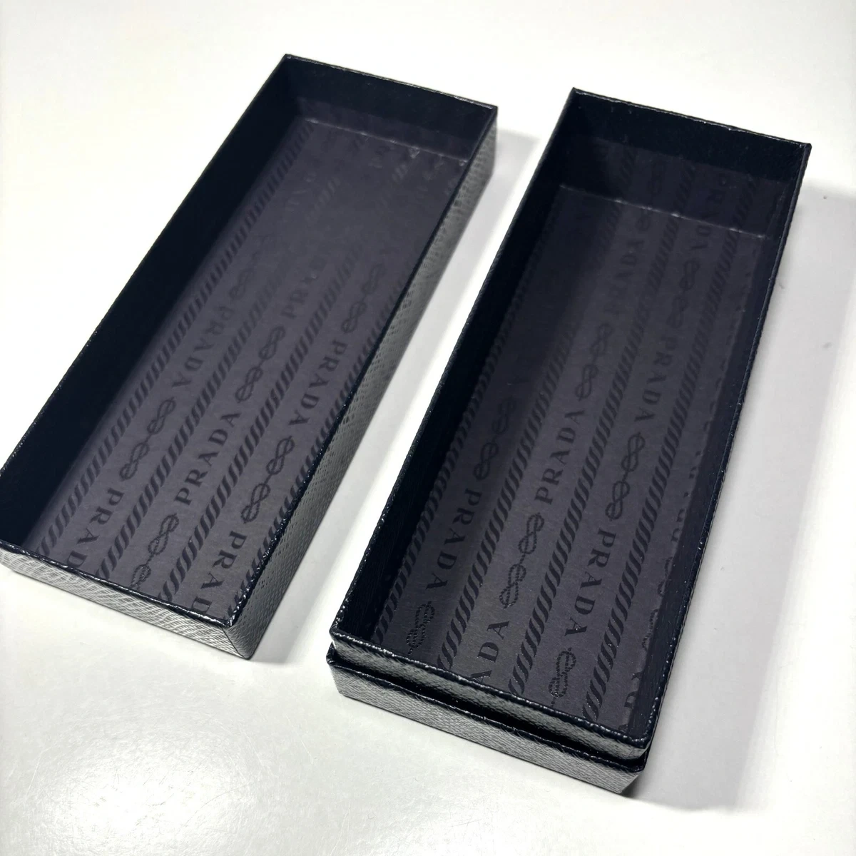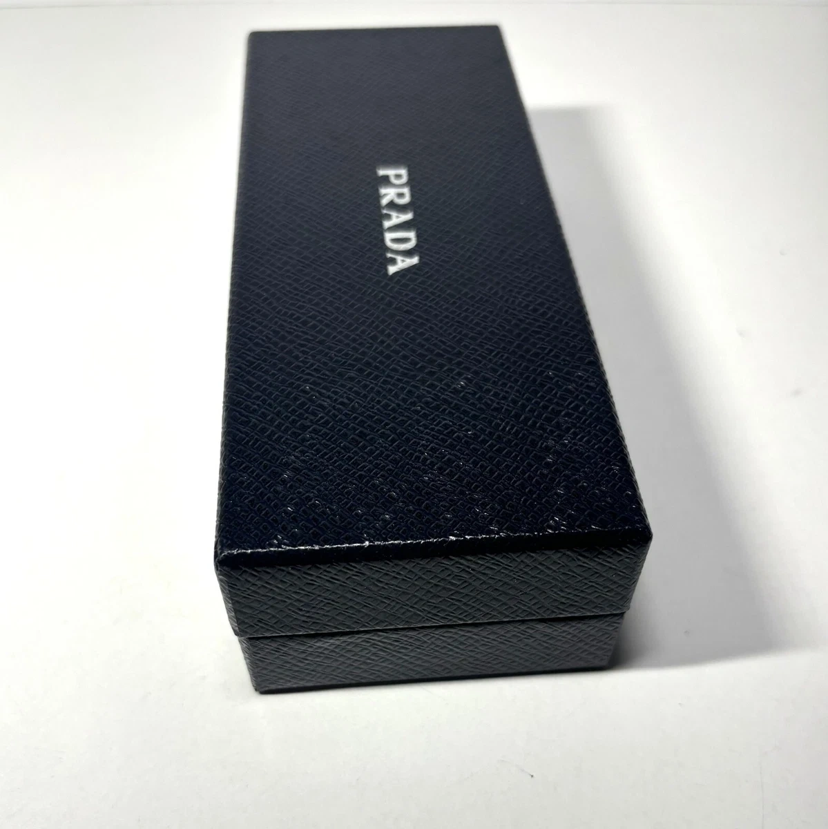 This is a Prada eyeglasses box. It's made of textured black material with a patterned interior. The box includes an outer sleeve and an inner tray. No cover!