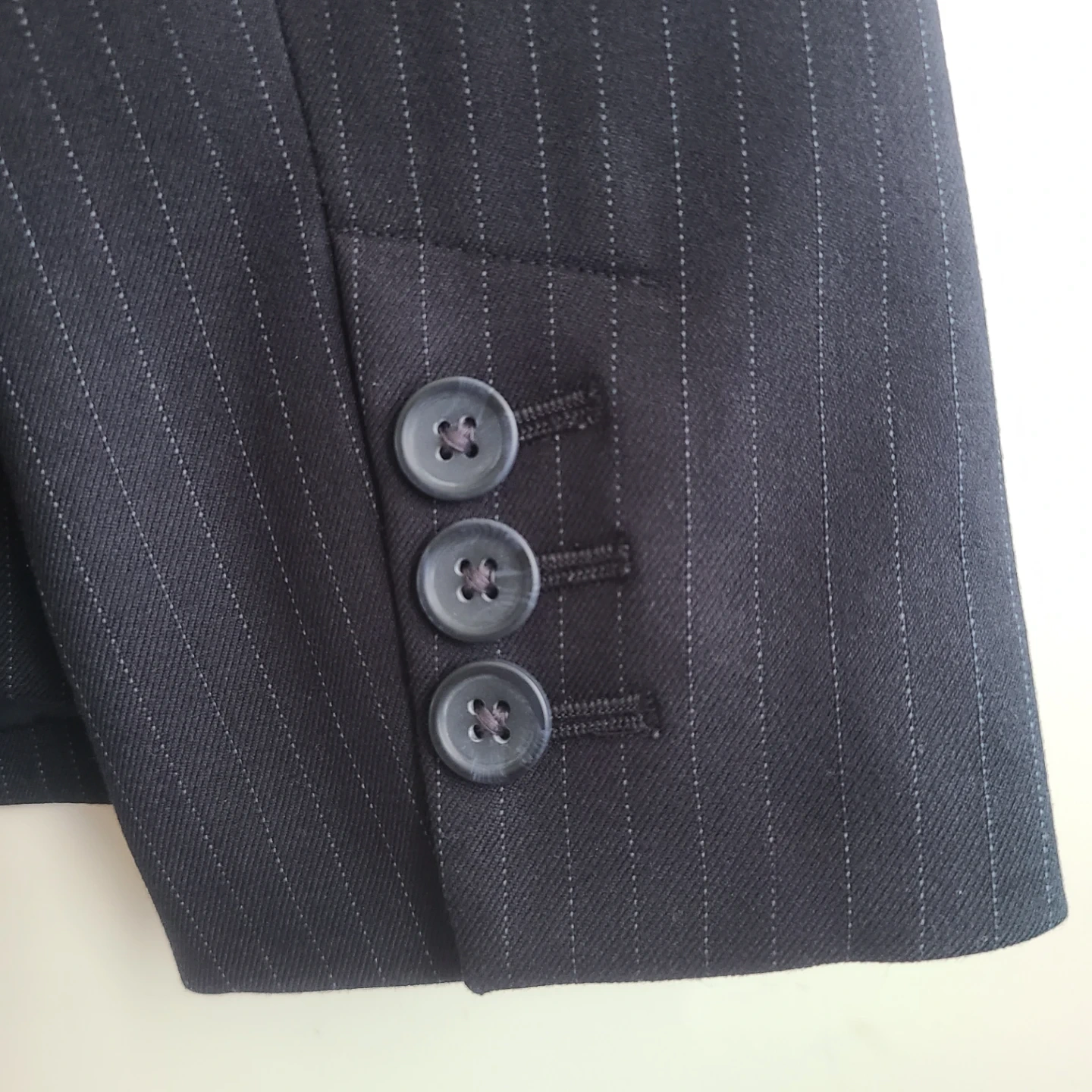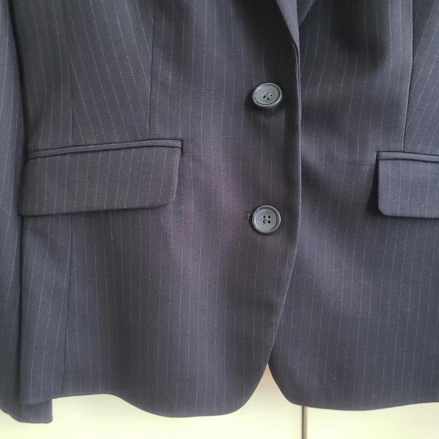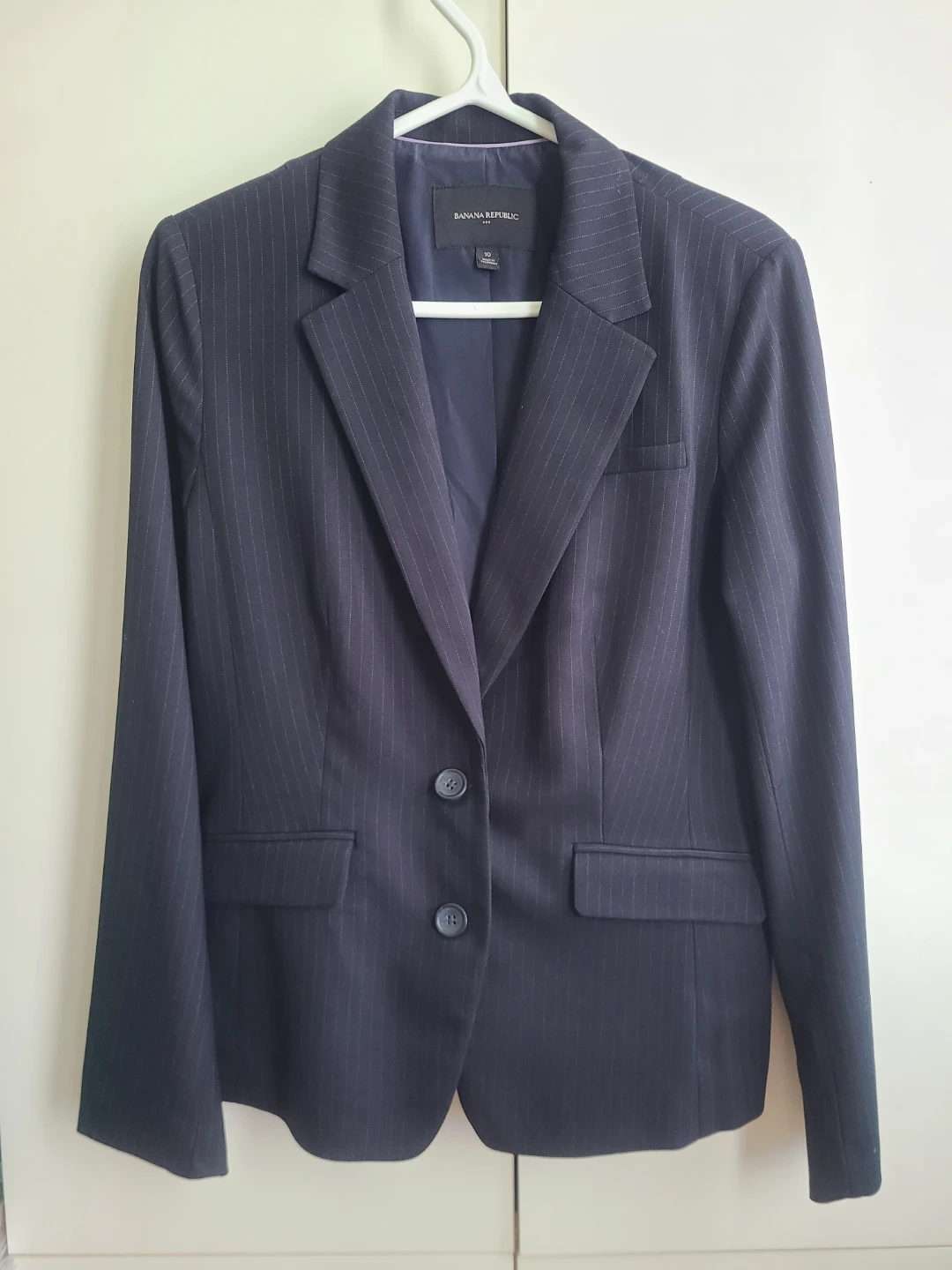 This is a Banana Republic pinstripe blazer in a women's size 10. It's a classic navy colour with subtle white pinstripes. The blazer has a two-button closure and front pockets.