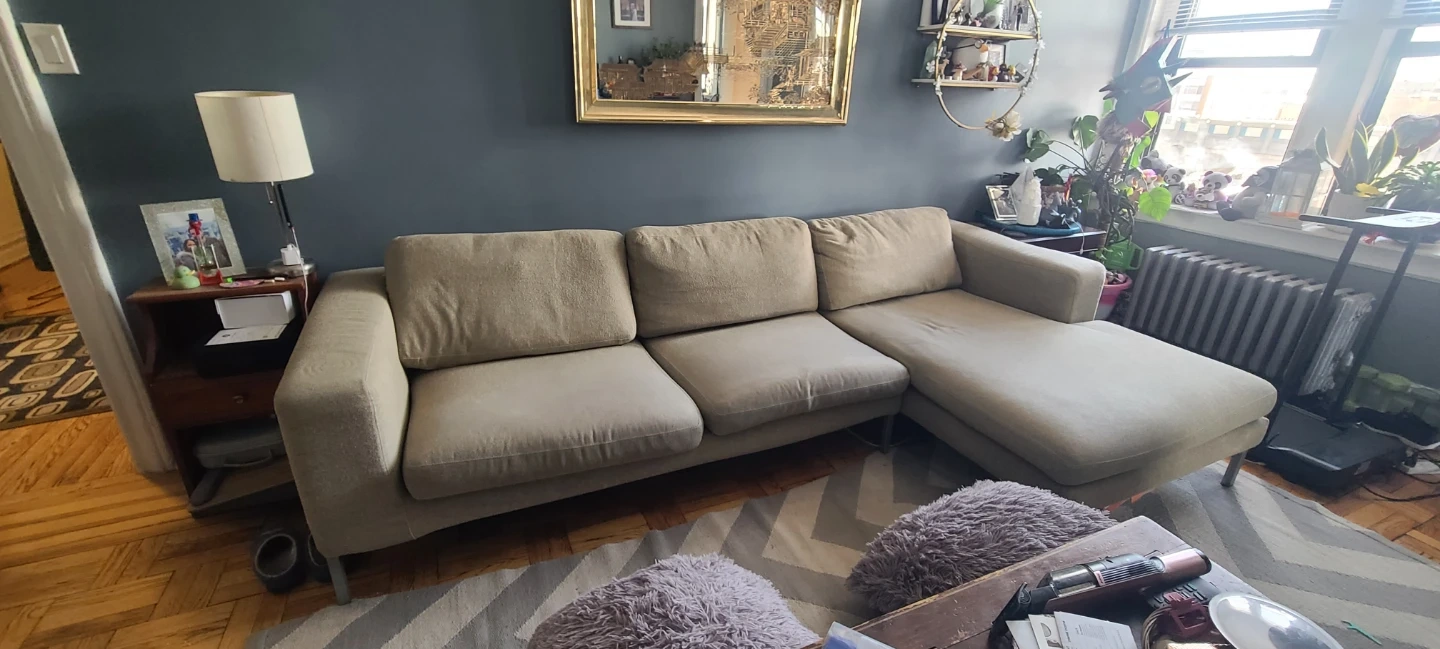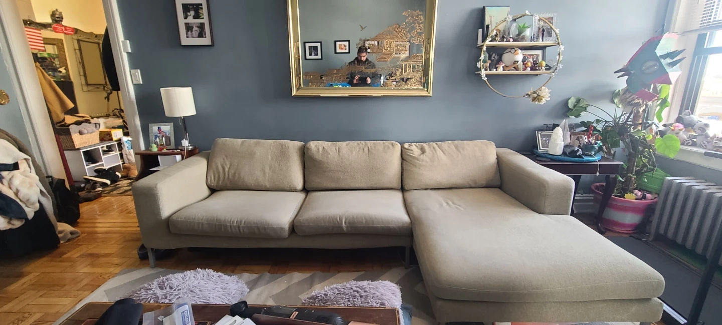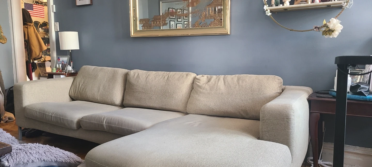 Stunning sectional sofa! This high quality beige couch was orgianlly $5000. The fabric comes off to easily wash, and the sectional part is able to detach making getting it into an apartment easy enough. Reach out to get this fantastic opportunity of a couch