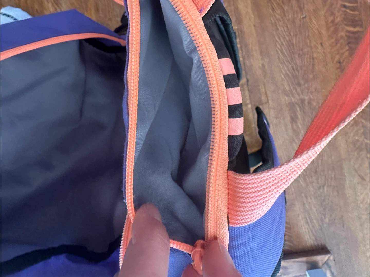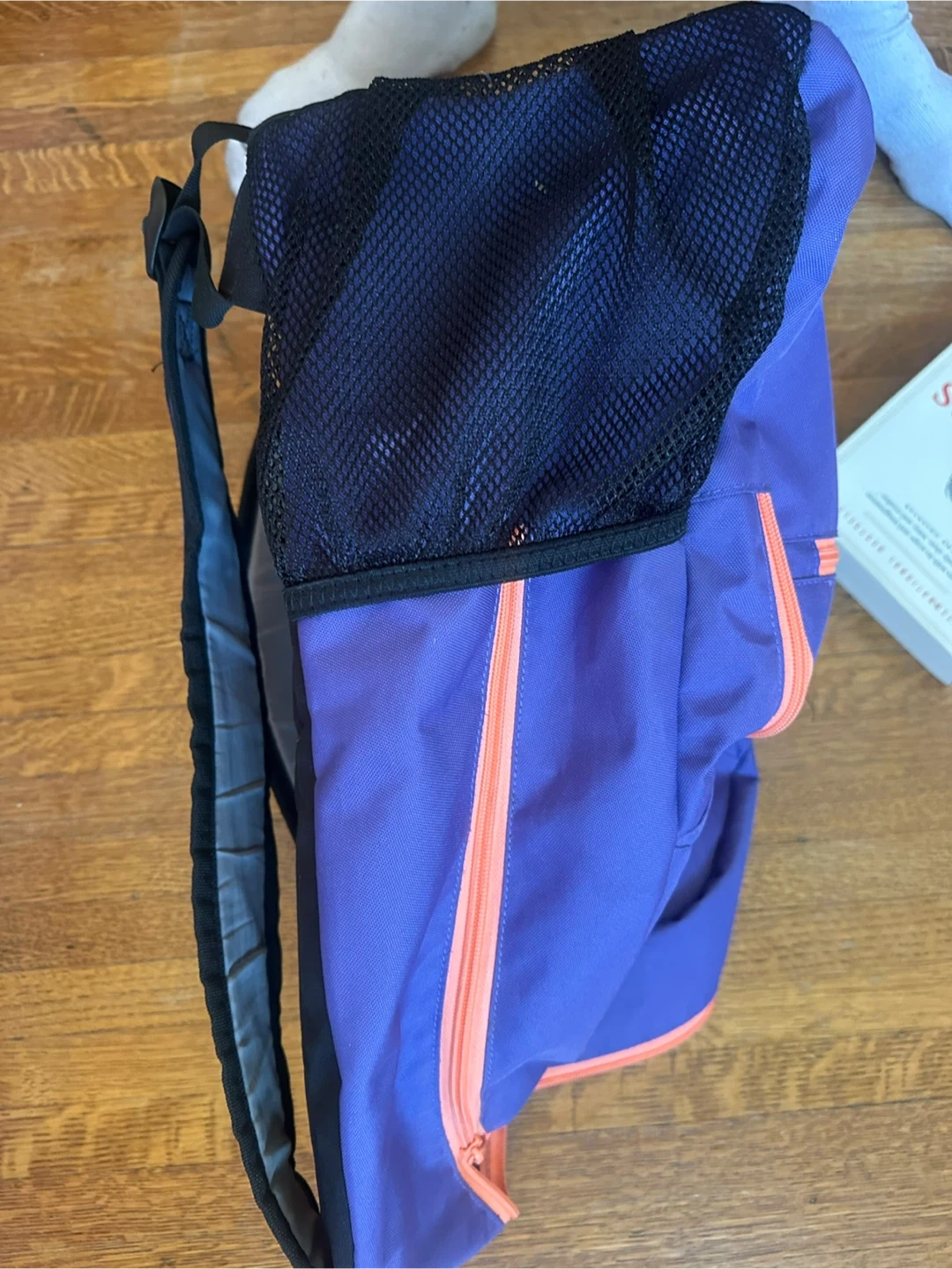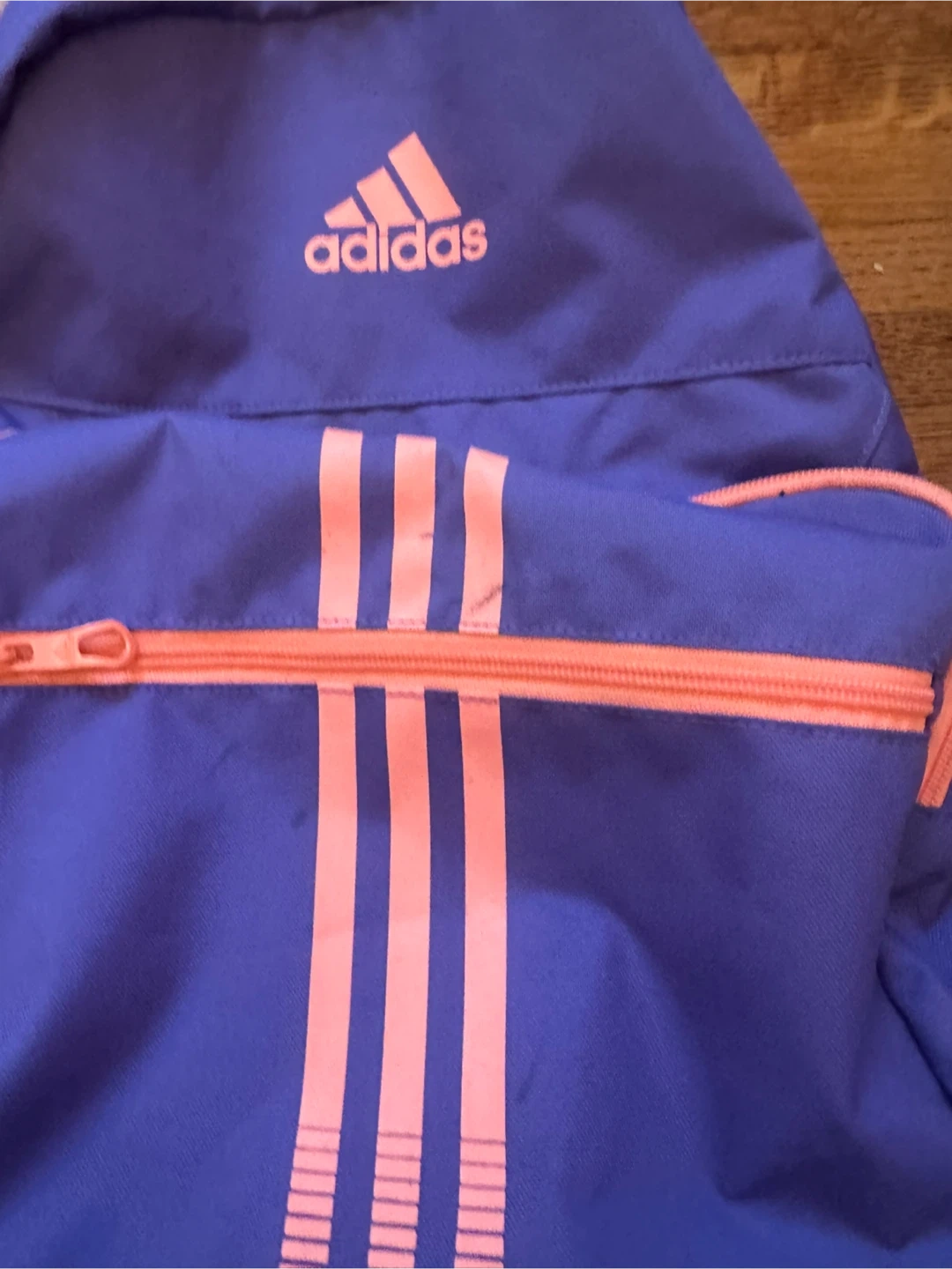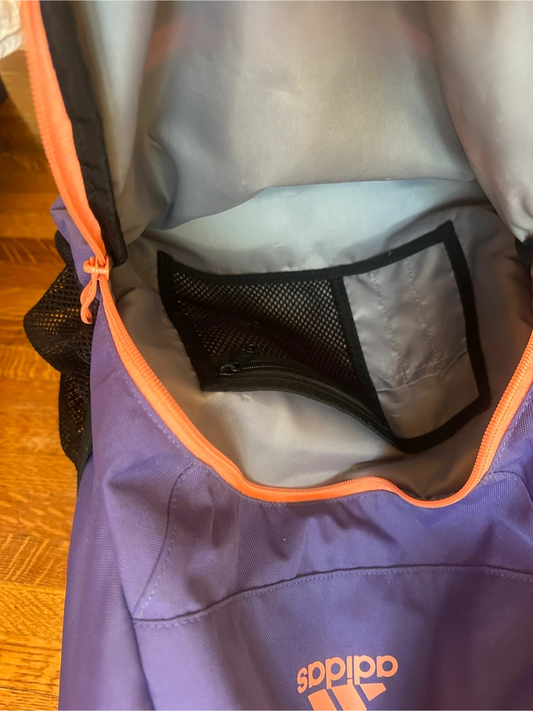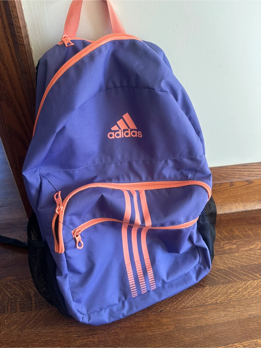 This Adidas backpack is a vibrant purple with contrasting orange zippers and signature stripes. It features mesh side pockets for water bottles or quick access items. It's perfect for school, sports, or everyday use!