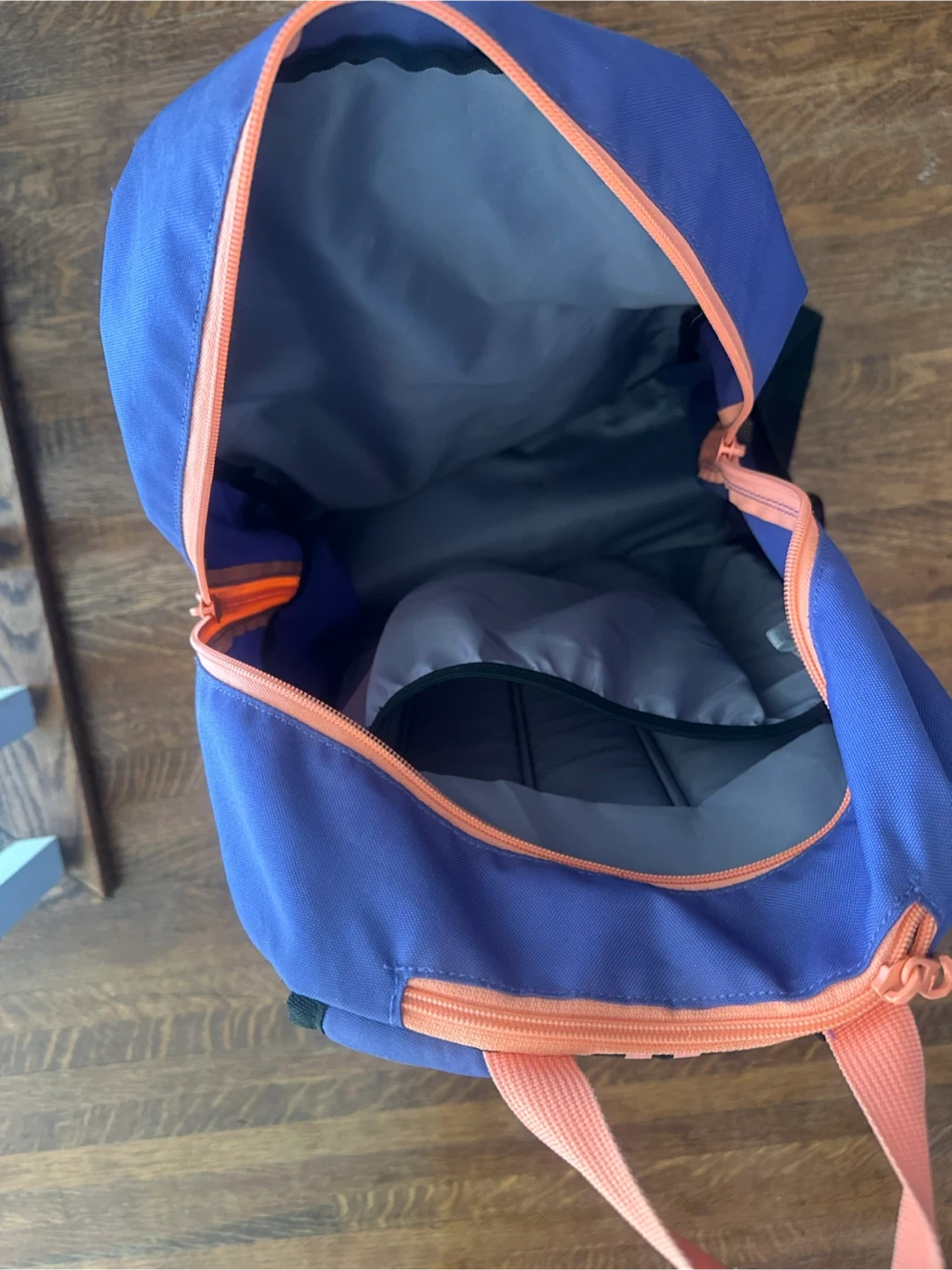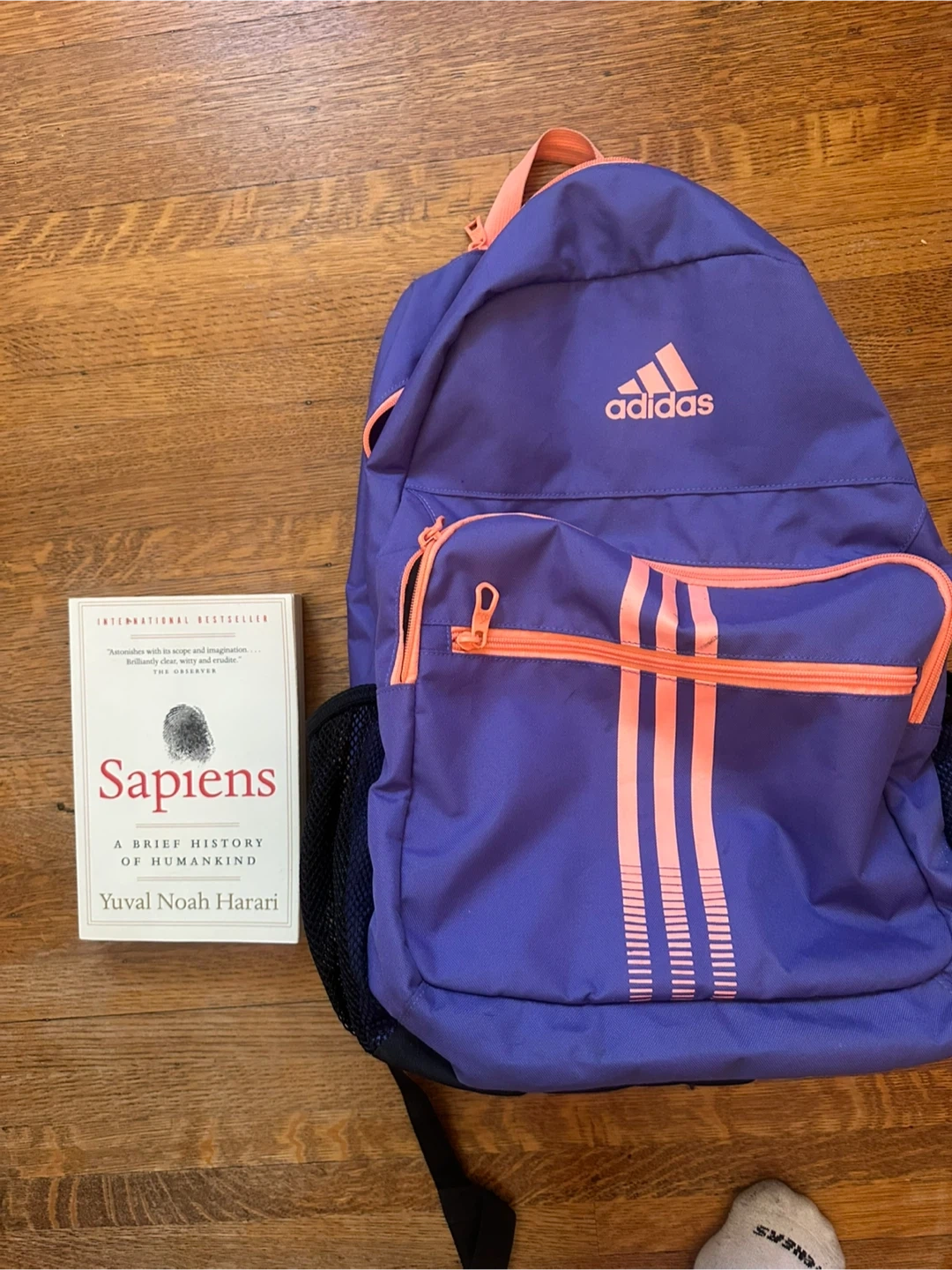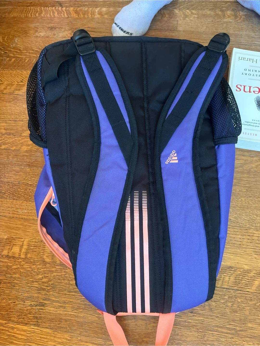 This Adidas backpack is a vibrant purple with contrasting orange zippers and signature stripes. It features mesh side pockets for water bottles or quick access items. It's perfect for school, sports, or everyday use!
