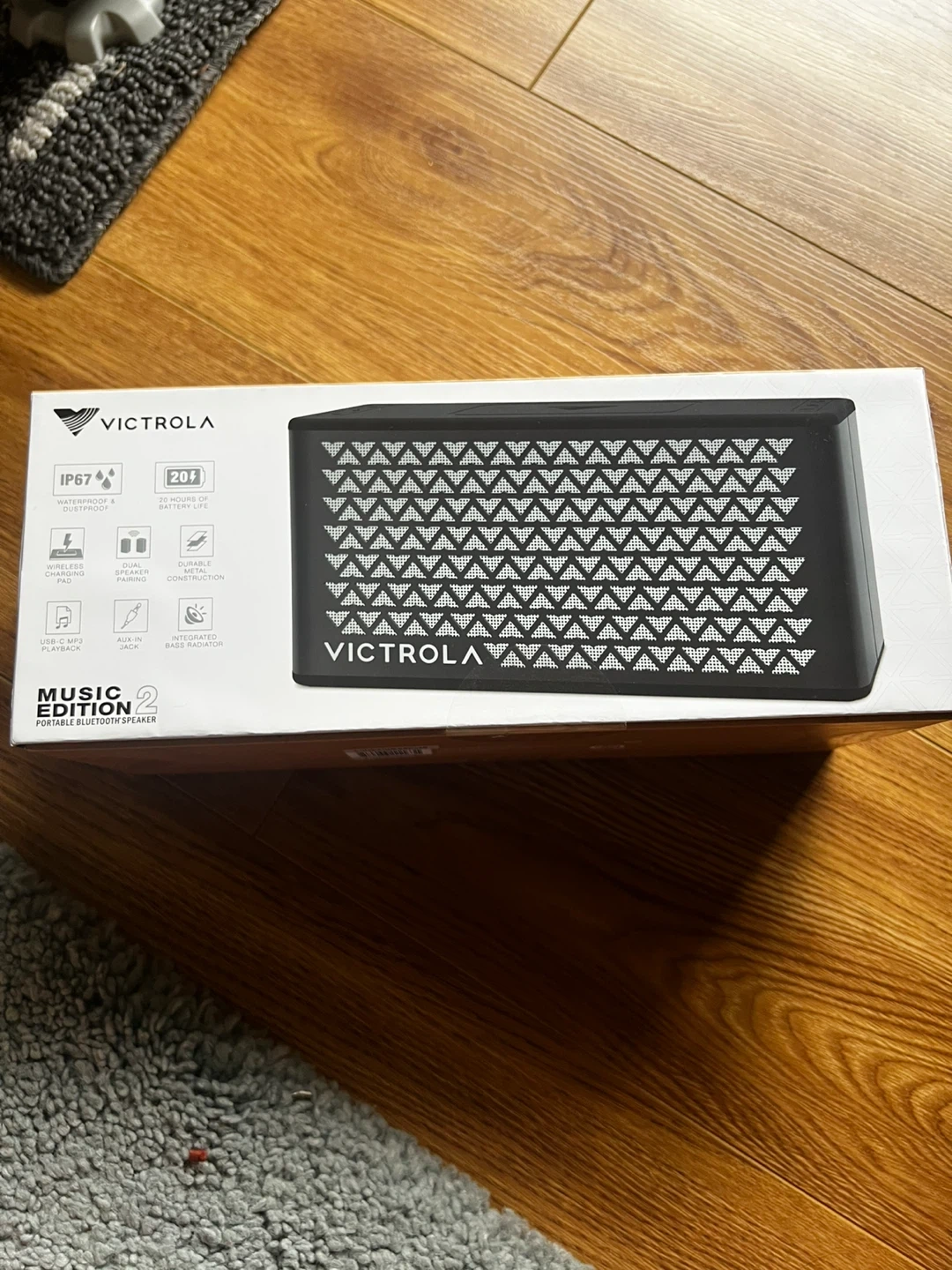 This Victrola portable Bluetooth speaker is IP67 dustproof and waterproof. It offers 20 hours of battery life and dual passive radiators. USB-C charging and aux in connectivity are included.