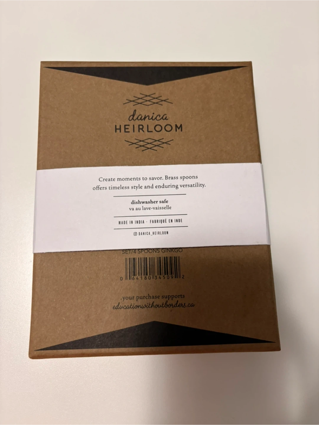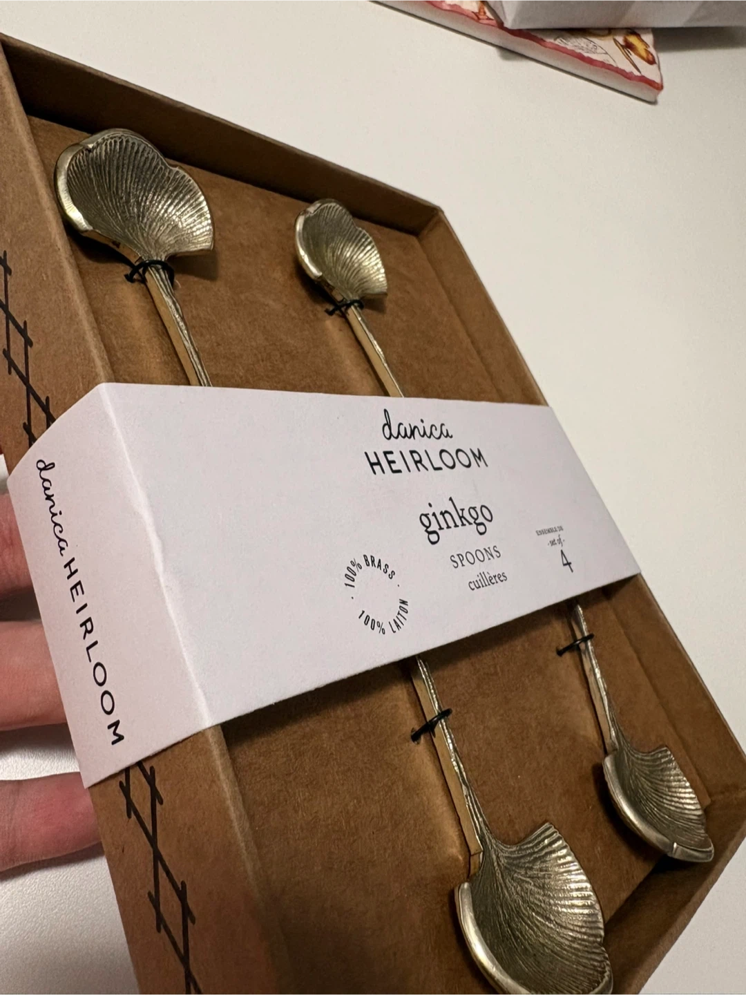 Brand new set of 4 Danica Heirloom Ginkgo spoons. Made from 100% brass. These spoons are dishwasher safe.