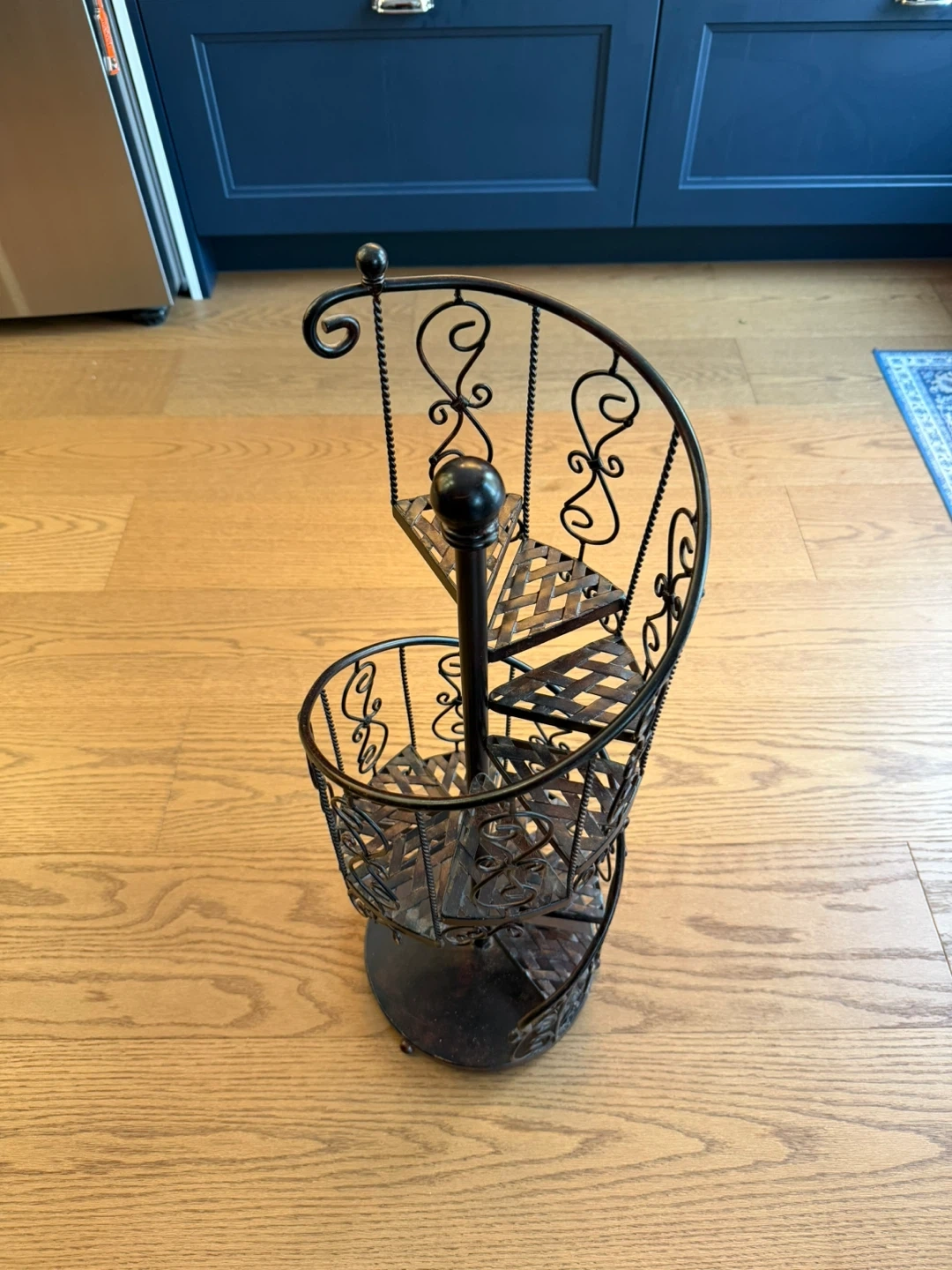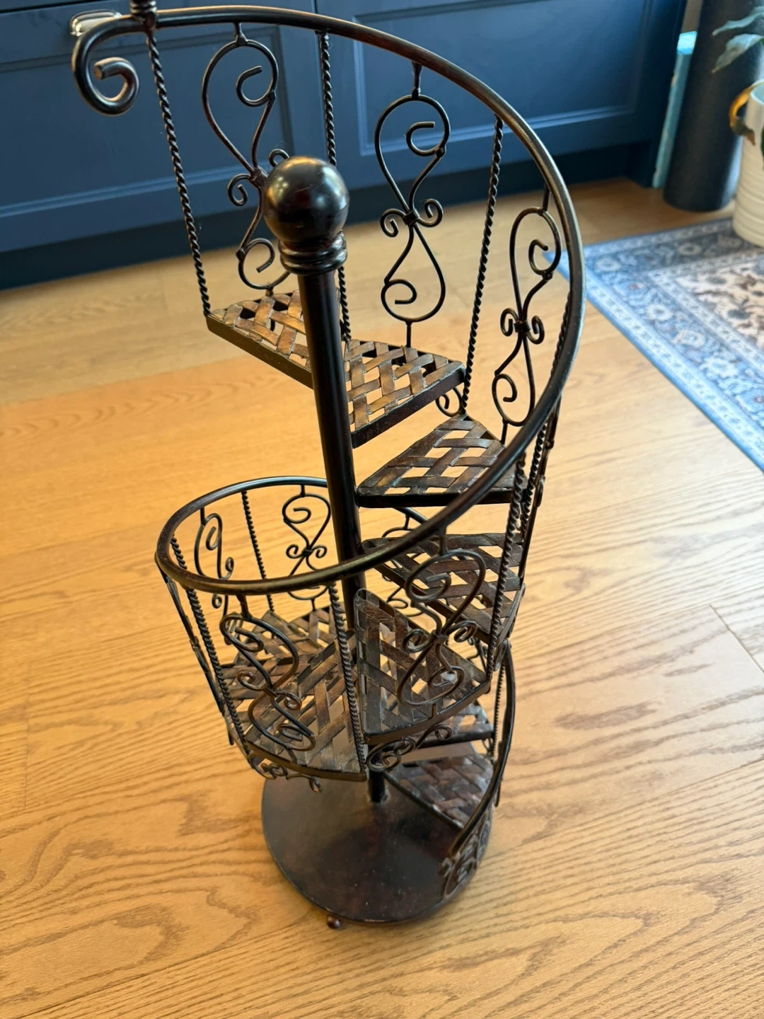 A luxury decorative metal display stand designed like a spiral staircase. It features multiple small shelves and a platform at the base. Perfect as a decoration next to fire place or corners in the room.