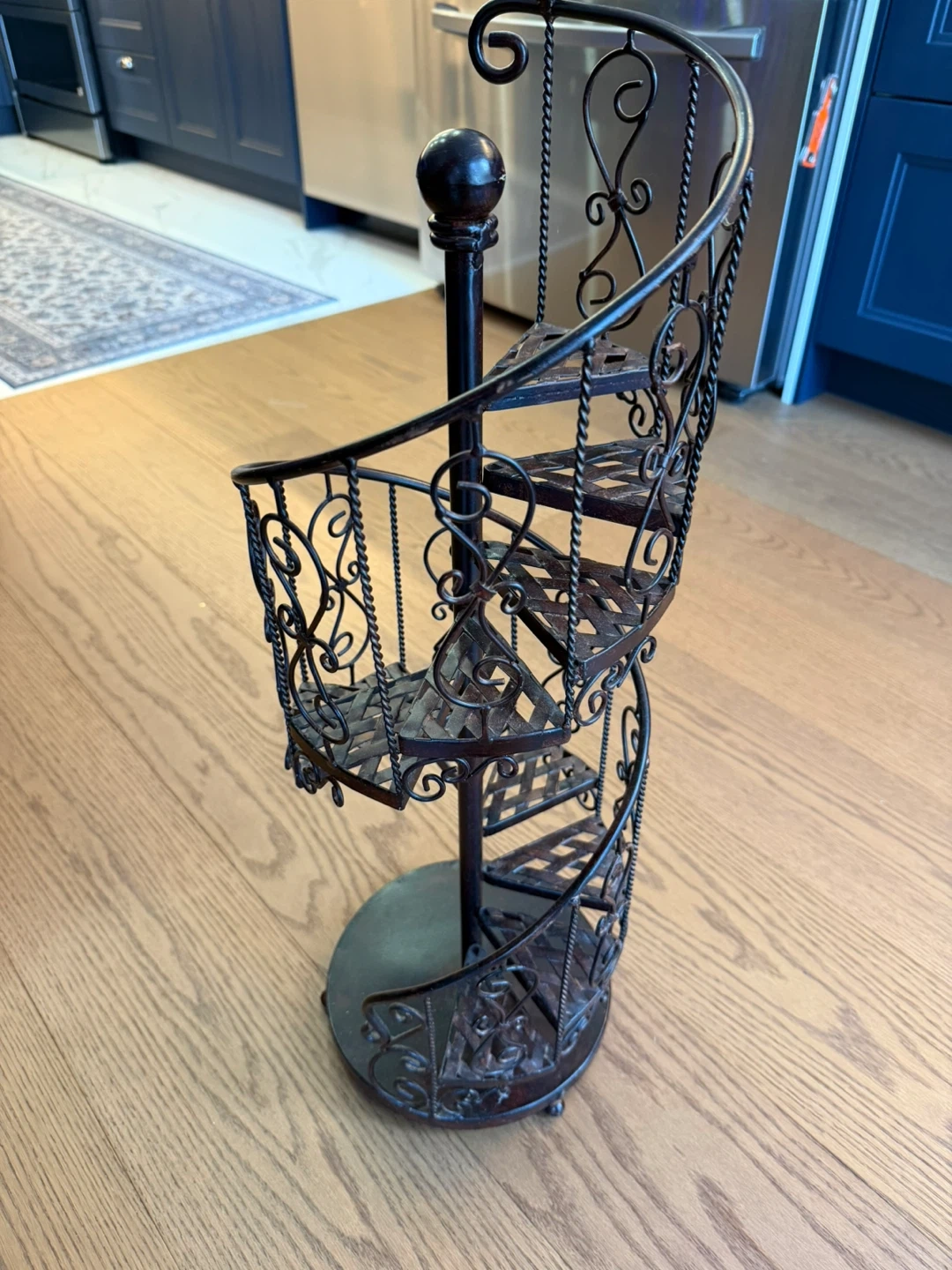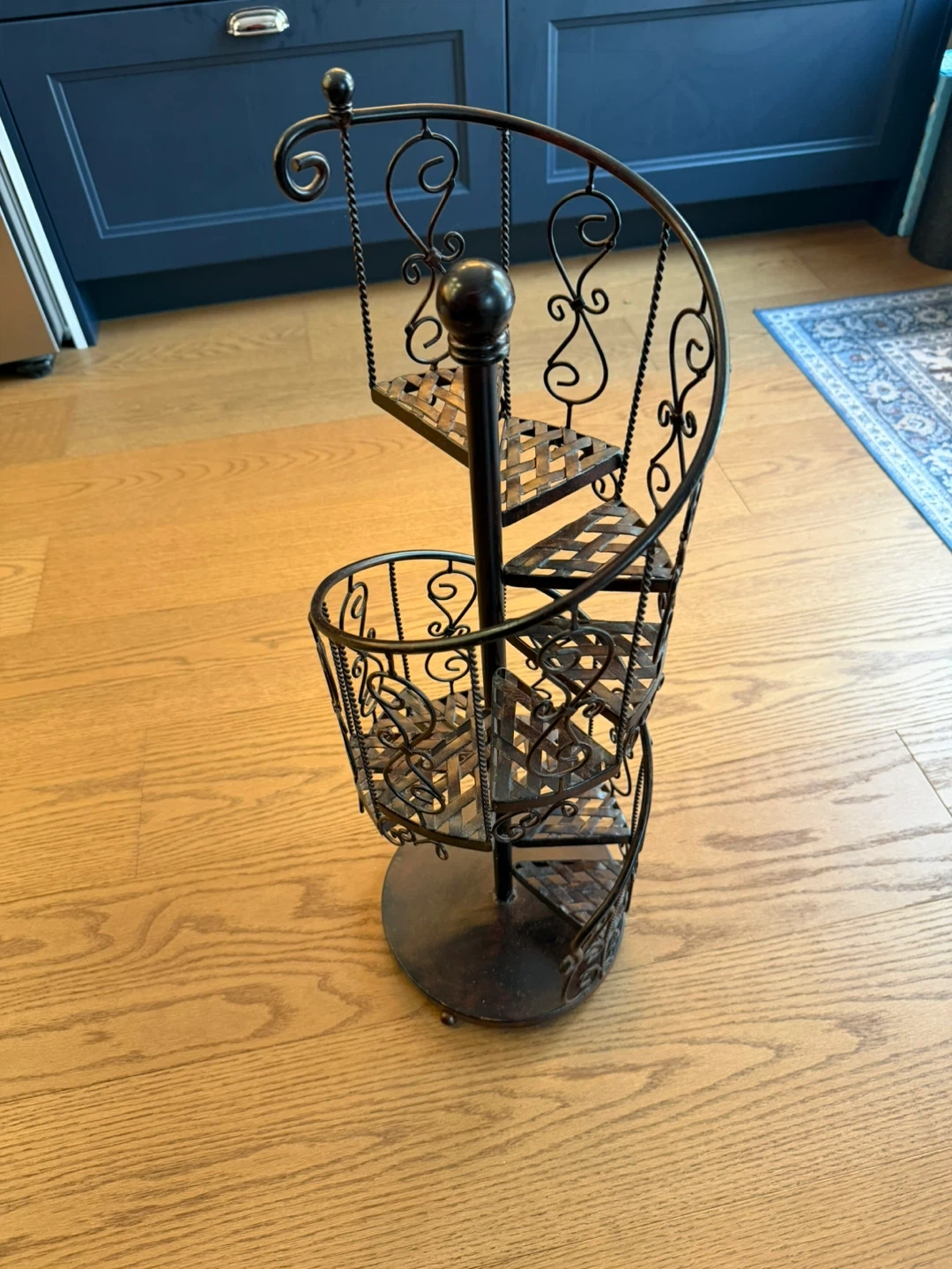 A luxury decorative metal display stand designed like a spiral staircase. It features multiple small shelves and a platform at the base. Perfect as a decoration next to fire place or corners in the room.